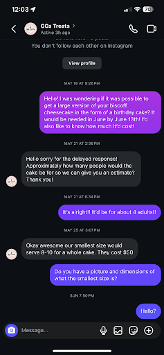 5+ stars. First the cookies are delicious. So soft but not under baked. Chocolate chip, peanut butter, sugar cookies, and regular brownie are amazing. I had them delivered while admitted in Presbyterian hospital and needed cookies in my life or I was going to escape and find cookies. Ha. Every place around Penn Presbyterian hospital were crazy expensive. GGs Treats was much more reasonable. 3 cookies for 3.50. Most places it was at least that for one cookie. Not certain of the size, but I'd rather have normal size cookies than one big cookie. I am going to be ordering from here forever. Great job GGs. These cookies have induced a craving in me for them. I must obey it. Definitely try them. Can't say enough about the peanut butter cookies. Melt in your mouth. Super dense reg brownies are so good. I dont think you can go wrong with what you choose. Theres a lot more I...