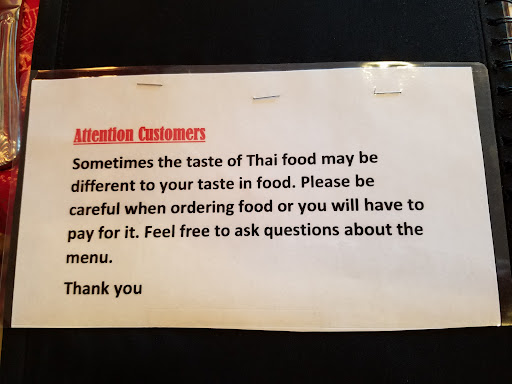 Read moreBad food and even worse service. We went there for wife's birthday. She tried to eat so as not to make me feel bad, but after trying to eat some of the food she finally said "I can not eat this, it has no taste and a funny smell". When I politely told the waiter about the problem and asked if my wife can have something else, the owner came up and said "you shouldn't have eaten so much of it if you didn't like it". The plate was still 75% full. We were offered no exchange, no sincere apology and no effort to make things better. I told them it was my wife's birthday and that this treatment was unacceptable, yet they couldn't care less. They just brought us the bill and we had to pay it. I also left my food almost untouched and we paid and left while the staff and owner did not mind us at all. They ruined my wife's birthday and our whole evening. Clearly the owner doesn't know what kind of customer treatment is minimally expected in a restaurant in the USA. Nobody has ever treated us like this before. We've had Thai food many times in other places but this place...