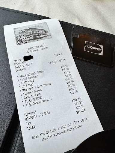 Very mixed emotions about our recent Fathers Day visit to the Jarrettown Hotel. Upon arrival we were told we would not be able to sit outside due to the restaurant being short staffed...we were on the fence about this anyway so not that big of a deal. After we were seated indoors, we were presented with our menus and fresh poured glasses of water, some on to my menu which then travelled on to my lap but these things happen so, again not a big deal. We then placed drink and appetizer orders; my drink from the bar came very quickly, hand delivered by the bartender himself, but the other drinks lagged significantly. it was long enough that we made some bets, jokingly, which would arrive first- the drinks or the appetizer. Sadly, I lost as the drinks came before the apps...evidently there was a mix up at the bar which had our waitress waiting for the mixed drink which had already been on the table for quite some time. Again, no big deal. I must note- the Lobster Bisque was absolutely delicious as was my Red Beet Salad. Must try's if these are in your wheelhouse! We were then introduced to the specials that day, (all of which sounded delicious btw) and I was enticed to order the Chilean Sea Bass. My wife selected another special while my son ordered off the menu. Unfortunately, they had ran out of that aforementioned delicious sounding Chilean Sea Bass so I resorted to the rack of lamb. Again, not that big of a deal. As we had been there for some time at this point, I was a bit disappointed that I had to ask if any bread was forthcoming and was told it would be out of the oven shortly...again, no big deal as who doesn't love fresh, hot bread? The entrees arrived soon after and, while I was not disappointed with my selection of the Lamb, the Filet was served with copious amounts of their demi glaze which really stifled the flavor of the meat which was not of the greatest quality. Perhaps this is the reason for the excessive sauce??? We may never know...but yet again, not that big of a deal. We declined dessert so I have no notes on that but a few of the ones that walked by us definitely looked delicious...maybe next time we said. Then came the check. This was the tough pill to swallow for the fact that it comes off really deceitful and underhanded. With no mention of it on the menu (for a party of 3) and no mention by the server, a 20% gratuity was included automatically. I have never seen gratuity added for a small party in all of my years of dining out so this really put a magnifying glass on our dining experience as a whole. As we are typically rounders when it comes to a tip this ultimately cost the server a couple of bucks but the money is not the issue as, to me, it will be the intent. I have to wonder how many folks left a tip unknowing one was already included? This simple act, perhaps merely an oversight, made everything that wasn't a big deal much bigger.
