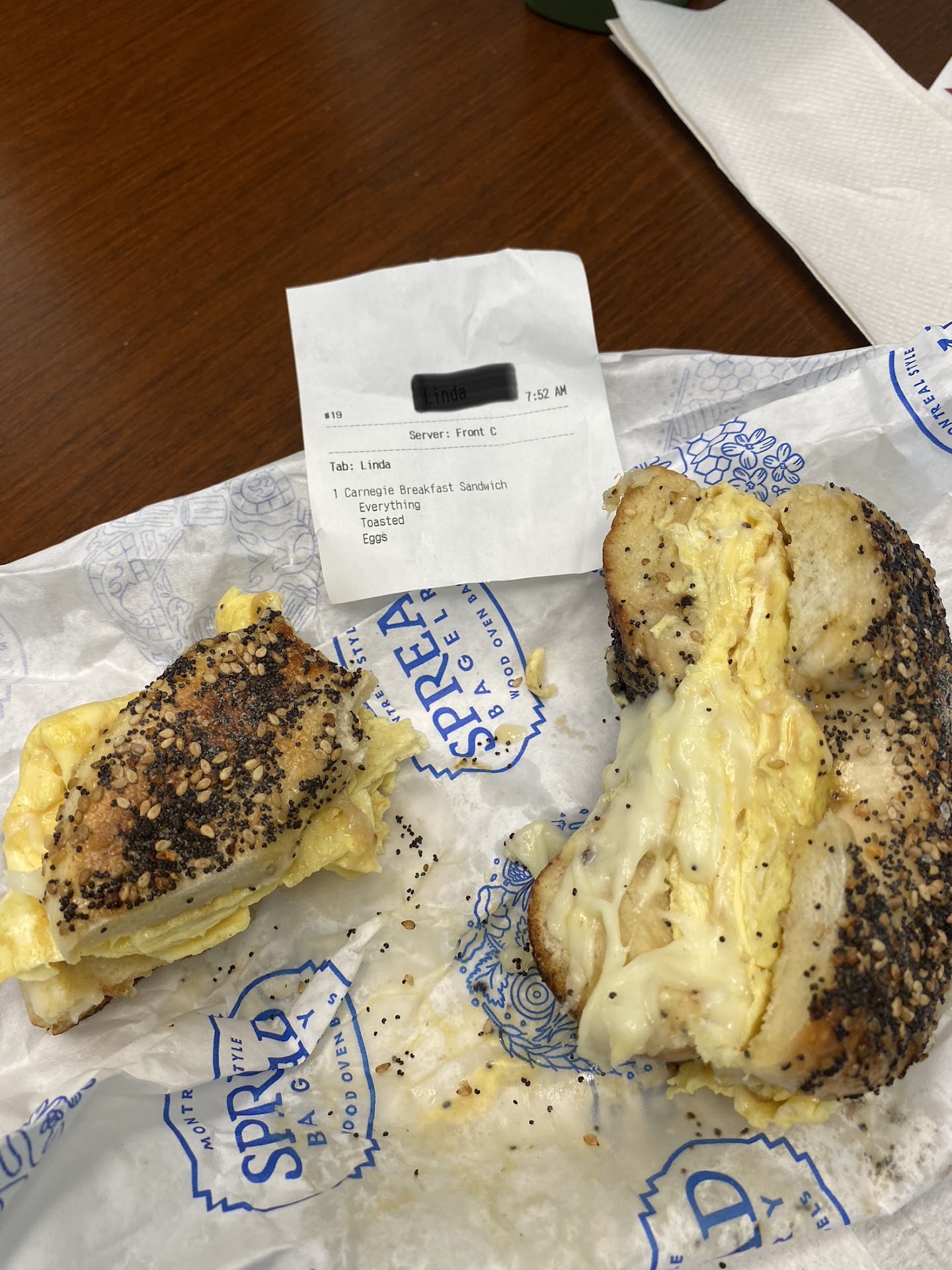Ā Ā Ā Read moreI tried to give this place the benefit of the doubt twice but after this last time I am definitely not going back. Sandwiches are expensive and fall apart completely. Cream cheese, egg, breakfast meat all fell out and my hands were completely covered even when I tried to keep it together in the wrapping. The rosemary bagel tasted pretty good and was well proofed the first time. Second time around I was given the smallest under proofed saltiest rosemary bagel that was tough, chewy and just off putting. I got a simple rosemary bagel with chive cream cheese and turkey bacon. They forgot the turkey bacon. Had to go back and get it. Overall not impressed. There are much better consistent and tasty bagel shop in the area like Bread & Bagel down the road. If the price matched the quality I would love to leave a better review. As someone who's worked as a bread baker for years and adores bagels this was a...