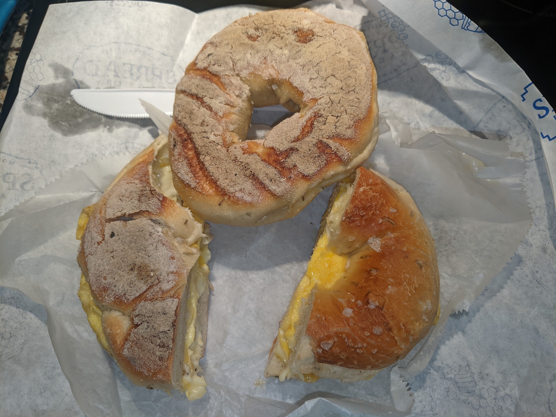 Read moreI tried to give this place the benefit of the doubt twice but after this last time I am definitely not going back. Sandwiches are expensive and fall apart completely. Cream cheese, egg, breakfast meat all fell out and my hands were completely covered even when I tried to keep it together in the wrapping. The rosemary bagel tasted pretty good and was well proofed the first time. Second time around I was given the smallest under proofed saltiest rosemary bagel that was tough, chewy and just off putting. I got a simple rosemary bagel with chive cream cheese and turkey bacon. They forgot the turkey bacon. Had to go back and get it. Overall not impressed. There are much better consistent and tasty bagel shop in the area like Bread & Bagel down the road. If the price matched the quality I would love to leave a better review. As someone who's worked as a bread baker for years and adores bagels this was a...