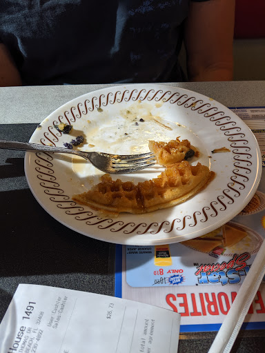 Read moreSeemed like a typical wh,it was busy but we were able to walk in, look around and sit down in a booth. Now is when it gets different. It took approximately 5 minutes before we were approached, that all went well, we ordered she got our drinks and our food came out in a reasonable amount of time. Then we realized we didn't have toast and a side of sausage. So we asked about both and awhile later she brought out the toast at which point we asked for the sausage again. We received the sausage just in time to finish the meal. About the meal, it was lukewarm definitely not the typical steaming hot plate we have come to know at wh. While we were waiting our waitress was complaining to another table about how the last table gave her a poor tip...hmmm look inward ... stop blaming others and focus on being your best self. Oh the sausage was hot and she stil received a 5 dollar tip from our 21 dollar breakfast. Go to the waffle omlet house just down the street... you will be glad u did ... see my review for them .... hope u...