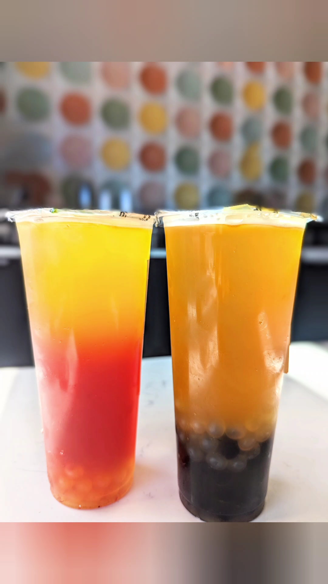 The bubble tea was so much fun. I custom ordered a green tea with passion fruit and bubbles and lychee popping bubbles. The second drink we ordered was a specialty drink from the menu called the Golden Hour which consisted of layered fruit juices and mango popping bubbles....