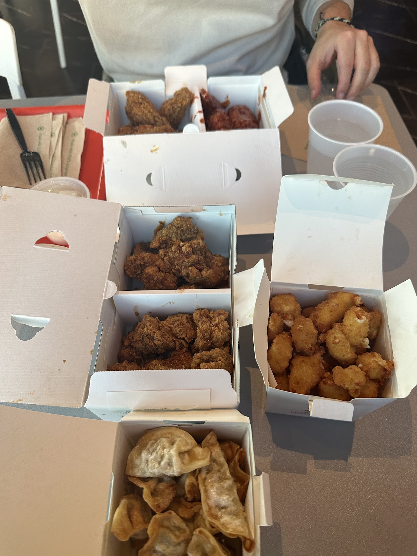 Read moreWe tried this place out on a Sunday afternoon. They have screens to order from inside. We ordered one 12-pc bone-in, and one 15-pc boneless for two people. We tried the Soy Garlic, Honey Garlic, and Sweet Chili sauces, ALL WERE AMAZING! We unfortunately made the mistake of not realizing you could “top” your chicken with sides and instead ordered a full side order of the deep fried gyozas and cheese curds. Suffice to say, it was pretty expensive, a total of $54 for two. We waited around 10 mins for the order, not bad at all. Overall, we thought EVERYTHING was amazing! The chicken was super juicy, tender and warm. The sauces were tasty. The sides were great, although I do wish (for the price!) they included some dipping sauces with the sides. The place was pretty empty, and clean. Service was good. We thought the package designs were clever! The tubs had a drip tray at the bottom so that oil drains and your food isn’t soggy. Overall would recommend and can’t wait to try again! Docking one star...