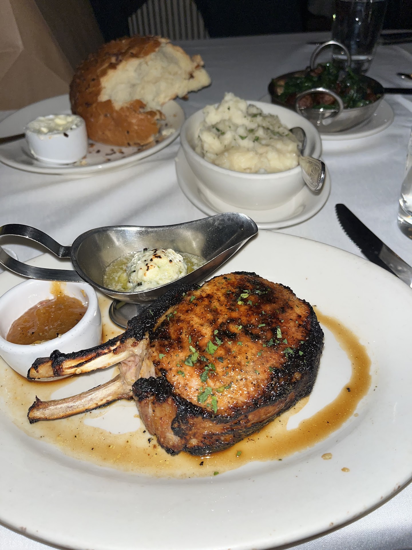 We ordered Bacon Wrapped Scallops for an appetizer. The Tomahawk Steak, the Salmon, and 3 side dishes. Our waiter came back & told us that they sold out of the Tomahawk earlier so we ordered the Porterhouse for 2. He was gone for 20 minutes before he came back with the manager to tell us that they sold out of the Porterhouse Steak as well.
