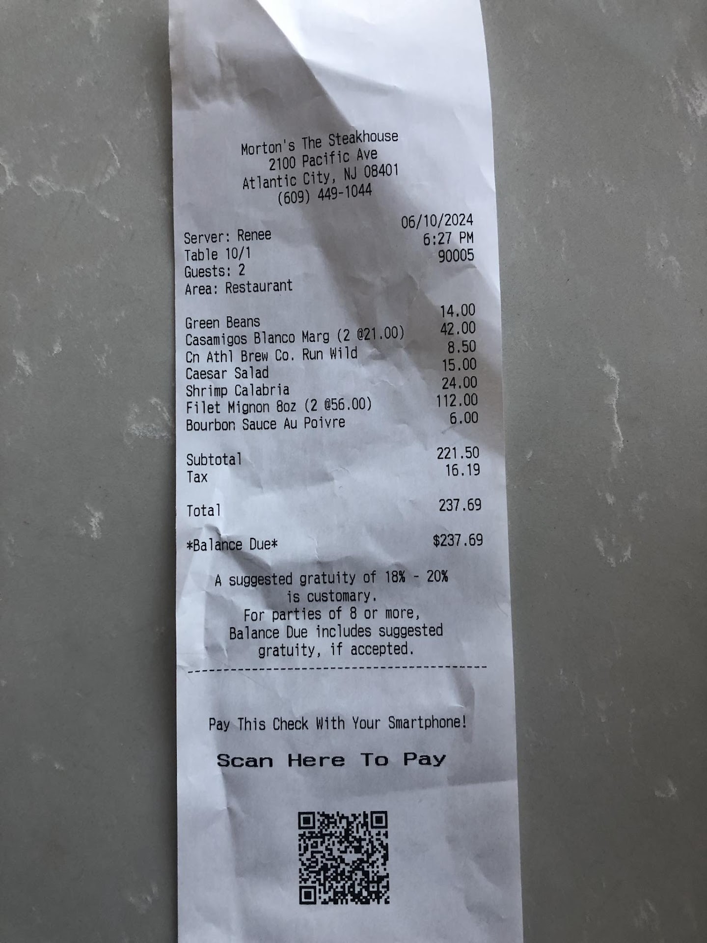 The manager then goes on to say that he’ll give us 2 different steaks at a discount to make up for the Porterhouse. I couldn’t believe we were at Morton’s Steakhouse going through this. “The only thing that’ll be different is there won’t be a bone”. LOL. Our waiter just stood behind him shrugging his shoulders.