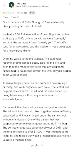 Thank you for taking the time to share your feedback. Weâre truly sorry that your experience at Peter Chang King of Prussia didnât meet your expectations. We value every guestâs feedback as it helps us continue improving.