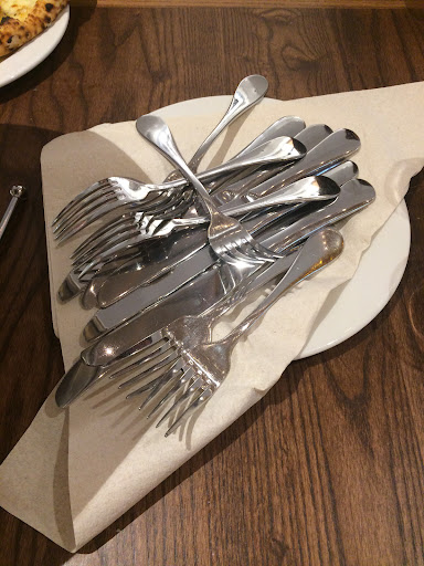 Read moreThe owner of this establishment should pursue other opportunities for the sake of the restaurant industry itself. I wonder if he or she has ever watched their staff in action.. probably not if these are the people they hired. We were a party of six and each couple ordered a pizza for lunch. Pizzas came out one at a time (not to mention burnt) and we waited ten minutes between each. We never got the napkins we asked for and please see attached photo for how we received our silverware after asking our waitress multiple times. Her response to slamming a plate of unrolled utensils on our table "Jesus Christ everyone is driving me crazy here today." After tolerating our tasteless pizza we promptly asked for our checks. Another employee told us she would split them for us because our waitress was nowhere to be found. We listed each individual item ordered, she wrote it down & came back with incorrect checks... three times. Our waitress reappeared and said she would fix them.. they again came back incorrect. We were finally fed up and just paid them as is because it was too painful to deal with the staff any longer. Once leaving, our waitress followed us out explaining that the other employee had written down the order wrong after she had already done so multiple times.. Do not be fooled by the welcoming decor. California Pizza Kitchen had a wait so we came here instead. Learn from our mistakes and spend time waiting for a table somewhere else instead of wasting it suffering through interactions with the...