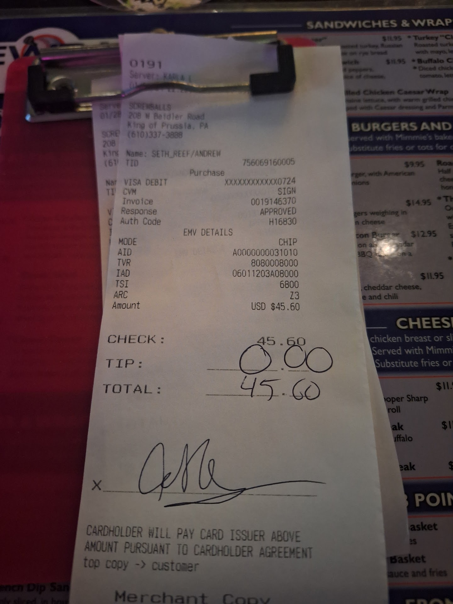 I've always had good experiences with Screwballs service and food however today my experience deserves a one star review. The server was miserable from the start. She took over five minutes just to acknowledge us and it wasn't done with a greeting. She put the menus on the table and asked what we wanted to drink. She never said hello and no joke, she never smiled throughout the entire interaction. Our drinks were served quickly but then we waited for over ten minutes, closer to 15 minutes to place our orders. There were only two tables occupied in the entire restaurant area, one being mine. The other table was being serviced by the bartender, not this server so she had one table to service which was my table. The bartender was handling the bar area like she always does so this wasn't a matter of this server working too many tables. The vibe she put out was that we were bothering her. I've never experienced this at Screwball's and I go there often, going back as far as the Fiddler's Green days. Our drinks were never refilled, we were never asked while eating if everything was okay or if we needed anything and when it came time for the bill, I had to flag her down well after we finished eating. Still no smile or effort to be friendly. Fortunately the food was good as always but when I go back to Screwball's, if she's still there I will request service from someone who wants to be there that's eager to earn a tip and not just expect it. This happened Sunday afternoon on November 6th around 2pm. Sorry it came to a negative review but this was deserved. I hope management addresses this because experiences like this are how restaurants lose customers even if those customers are mostly...