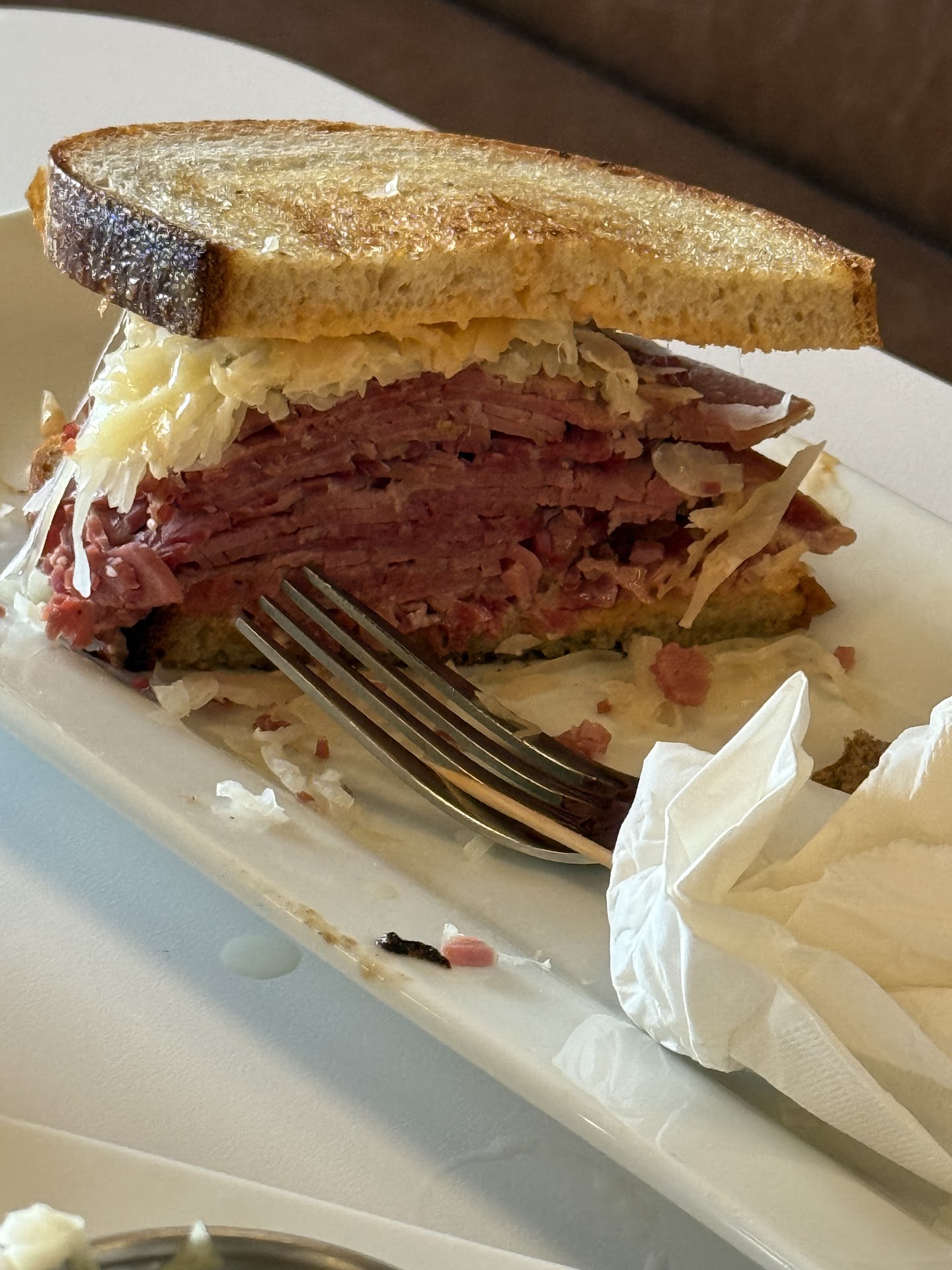 Now for the corned beef sandwich. Sure, it was huge â but letâs not kid ourselves: size doesnât mean bupkis when the meatâs not right. It was lukewarm, overly salty, and had the distinct taste of something cured way past its expiration of good judgment.