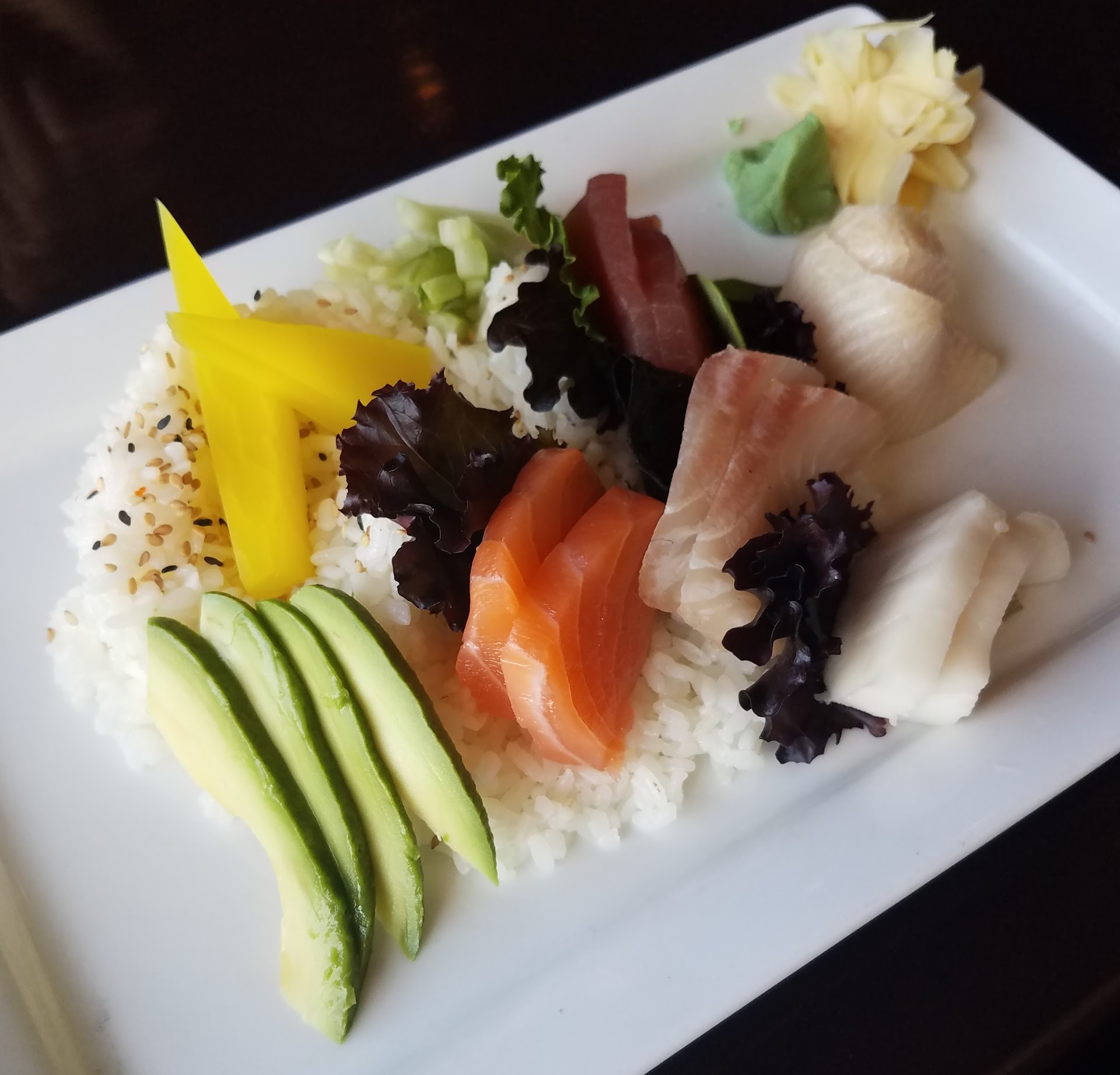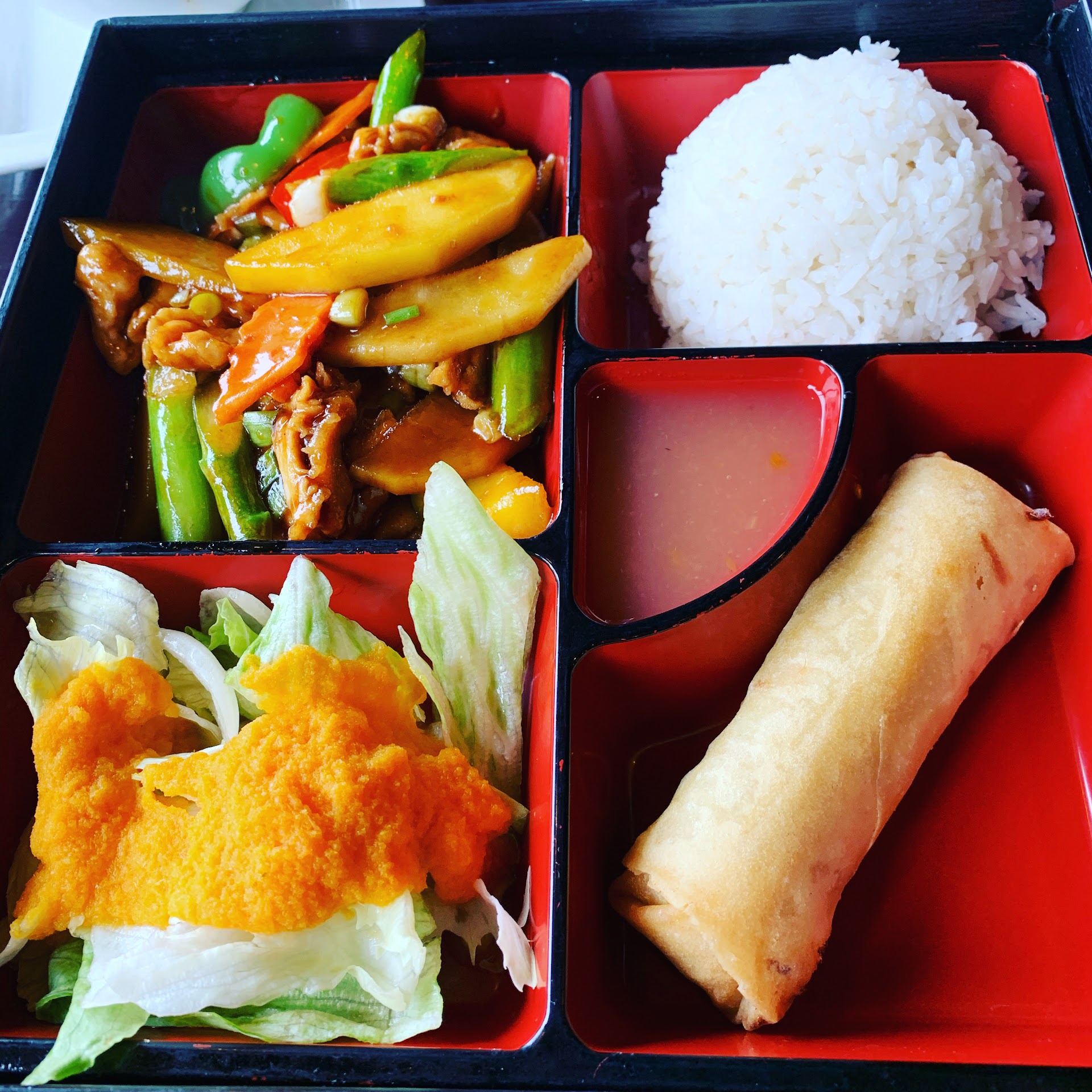 The food was borderline inedible. We ordered steamed pork dumplings, sesame chicken, and the sashimi platter. The pork dumplings were very doughy and weirdly dry on the outside. The inside was liquidy, but the filling overall was fine. The sesame chicken had an odd flavor to it that I wasn't expecting; it tasted almost like it had gone off, but I think it was an intentional flavor. I ate one bite, and spit the next one out. The rice that came with it was very mid, which I feel like is difficult with plain white rice. My fiancé's sashimi platter was served with the fish on top of lemon wedges, which made every piece taste like lemon and nothing else. The sashimi was also icy in the middle, as though it had been previously frozen. I guess if you wanted to mask the fact you're using frozen fish, you would use a lot of lemon.