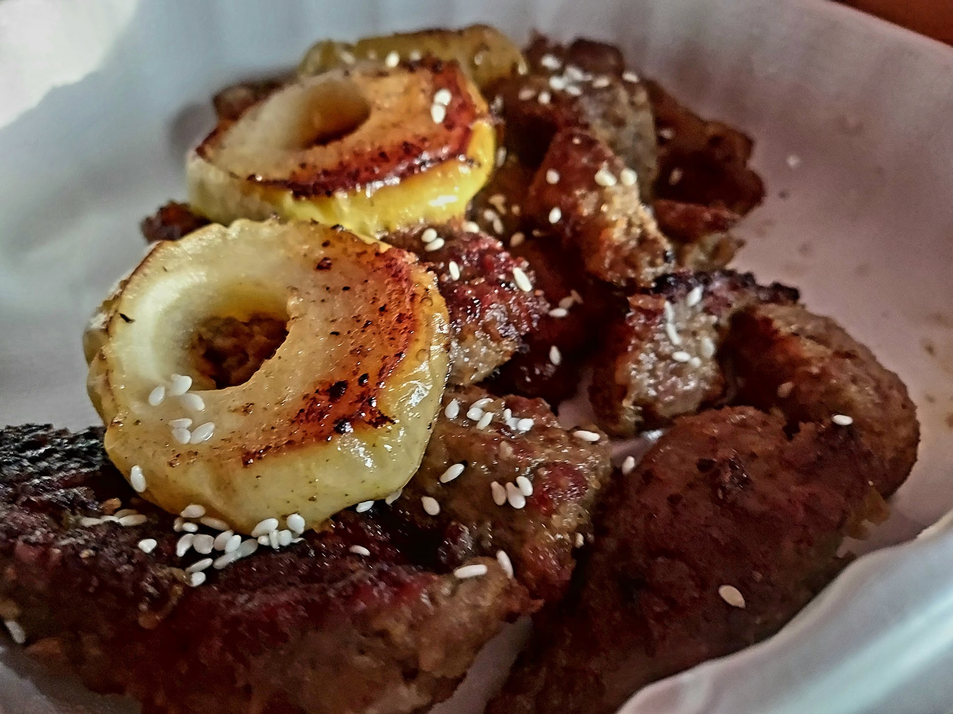 The "Hot Buns" were decent. Tried the "cheesy" kind with garlic, butter, feta cheese, parsley and cracklins. It was a good pairing to go with with the grilled eggplant in Adjika sauce (a sauce made with tomatoes, garlic and other sauces, not actually spicy despite the description on the menu). The eggplant dish is good on its own but feels like it would be better with some bread as an accompaniment.