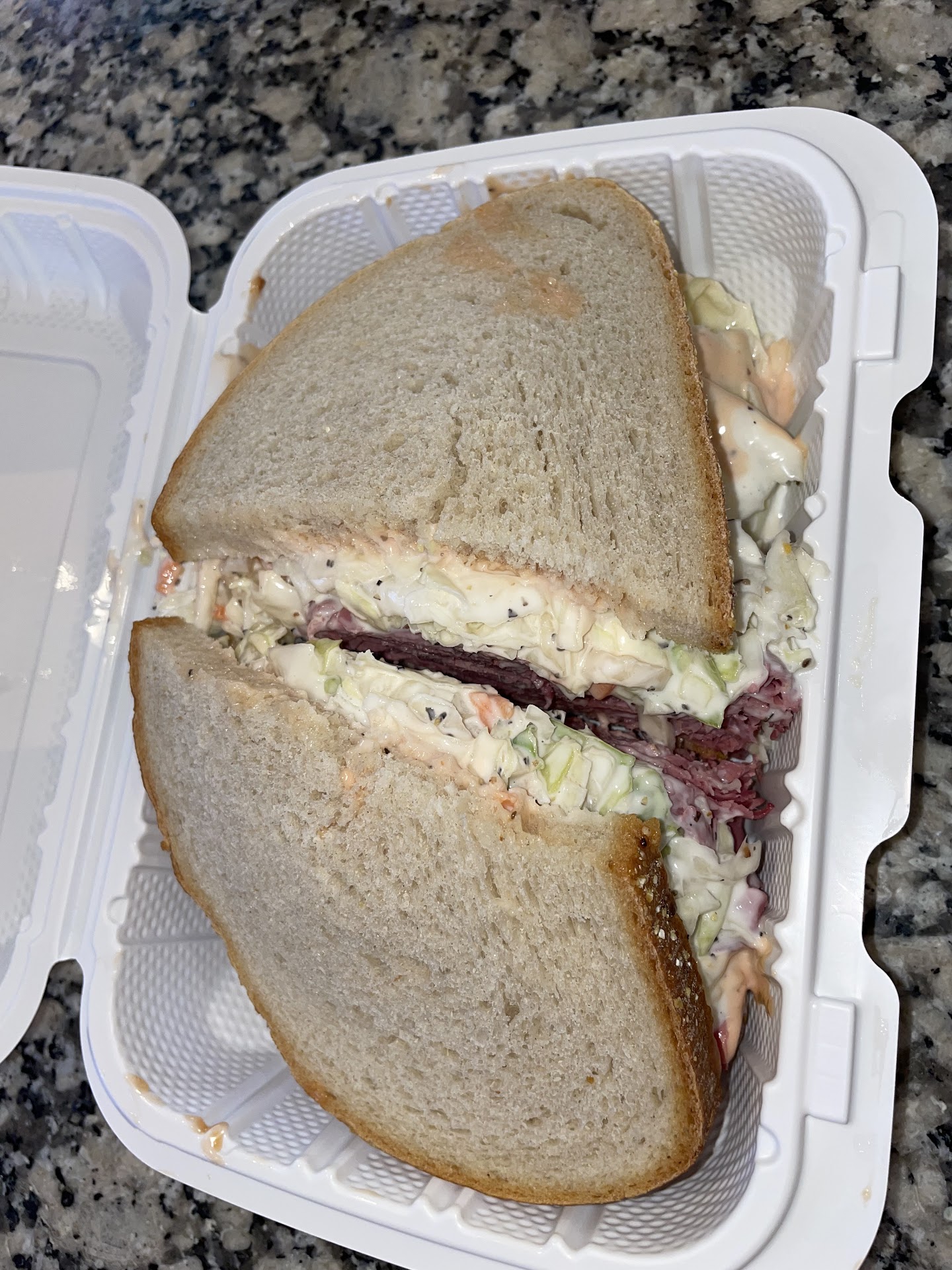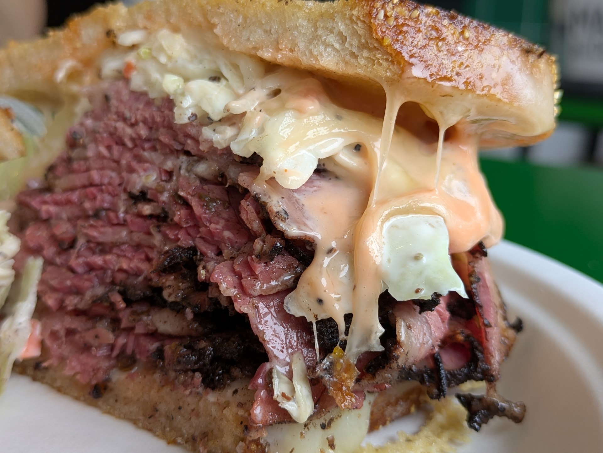 If I have to be critical, I'd say that all the flavors could be emboldened. The pastrami could be a bit saltier, with stronger pepper and coriander notes. The Russian dressing could be a little sweeter. And the coleslaw could've used a little more vinegar. All the textures were on point, but emphasizing the sweet and sour flavors would help to cut through the insulating beef tallow and bring fireworks to my tongue's taste buds.