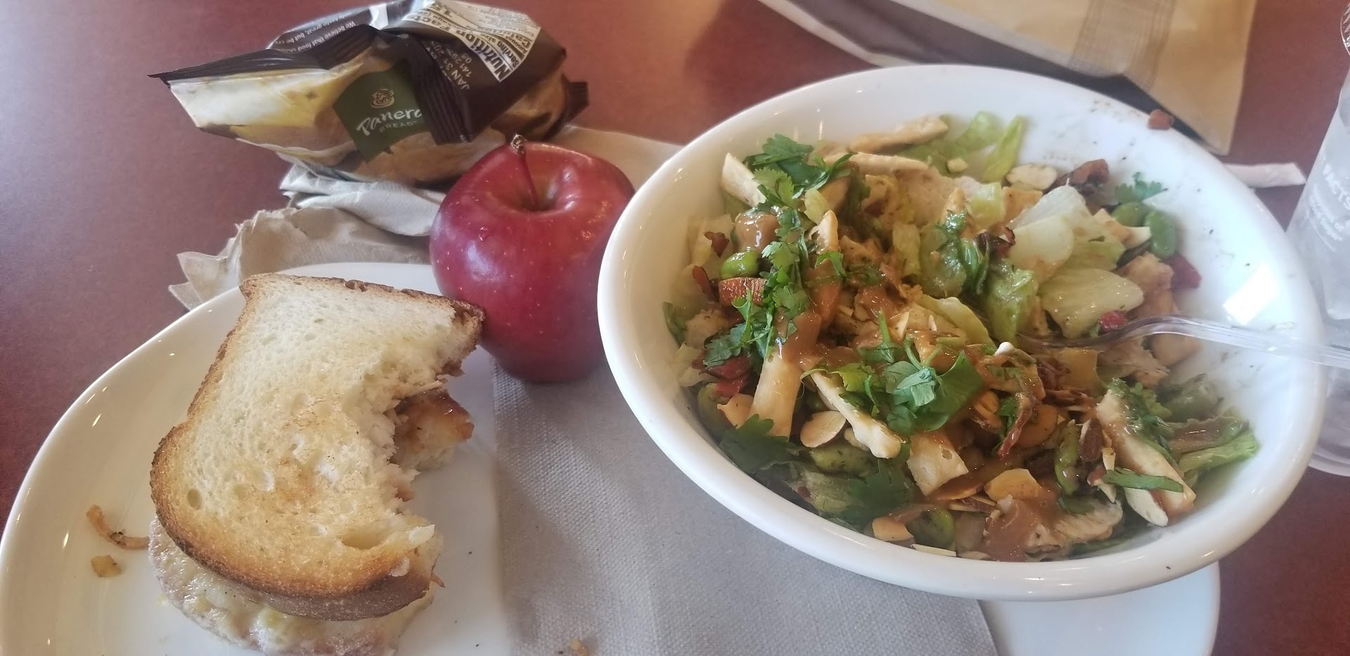Read moreThis was my first tasting and dining experience at a Panera Bread. I placed my order at the counter (vs. self order/checkout kiosk). The counter server was polite, knowledgeable and patient as I tried to choose between two choices. I ended up with the Pick 2 option and ordered the Fuji Apple Salad with Chicken and the half Smokehouse BBQ Chicken Sandwich with the complimentary baguette. I loved the salad and will definitely order that again. Ingredients were fresh and the dressing was light and sweet. The sandwich had good BBQ flavor and decent amount of chicken. I tasted my friend's Bacon Turkey Bravo sandwich and I think perhaps I enjoyed that more because it paired better with my salad. I also tasted the Cream of Chicken & Wild Rice Soup and that was delicious. Not heavy, good flavor, and finished it off with my baguette. I will definitely be back for the salad and soup alone. I appreciated the fact that everyone practiced their distancing when finding seating. I would've like to have seen the tables wiped...