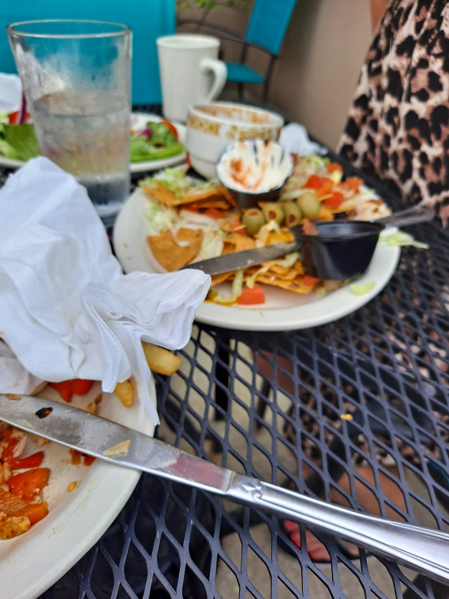 Today, I decided to give it another try, this time for supper. First, the cheap house wine was poured into a measured glass with lines and numbers on it. My double Dewars scotch barely covered the bottom of the glass. OK. They're still cheap...got it, no surprise there.