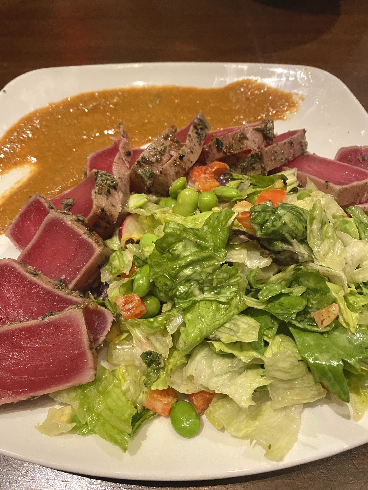 That being said, to start we got the seared ahi tuna appetizer which was absolutely delicious. The spicy mustard sauce is very spicy indeed. The salad that comes with it was really the star of the show. Dressed with the most amazing lime based dressing. The edamame and radish gave the salad great texture! The ahi tuna dish does not come with soy sauce, so we had to ask for it on the side.