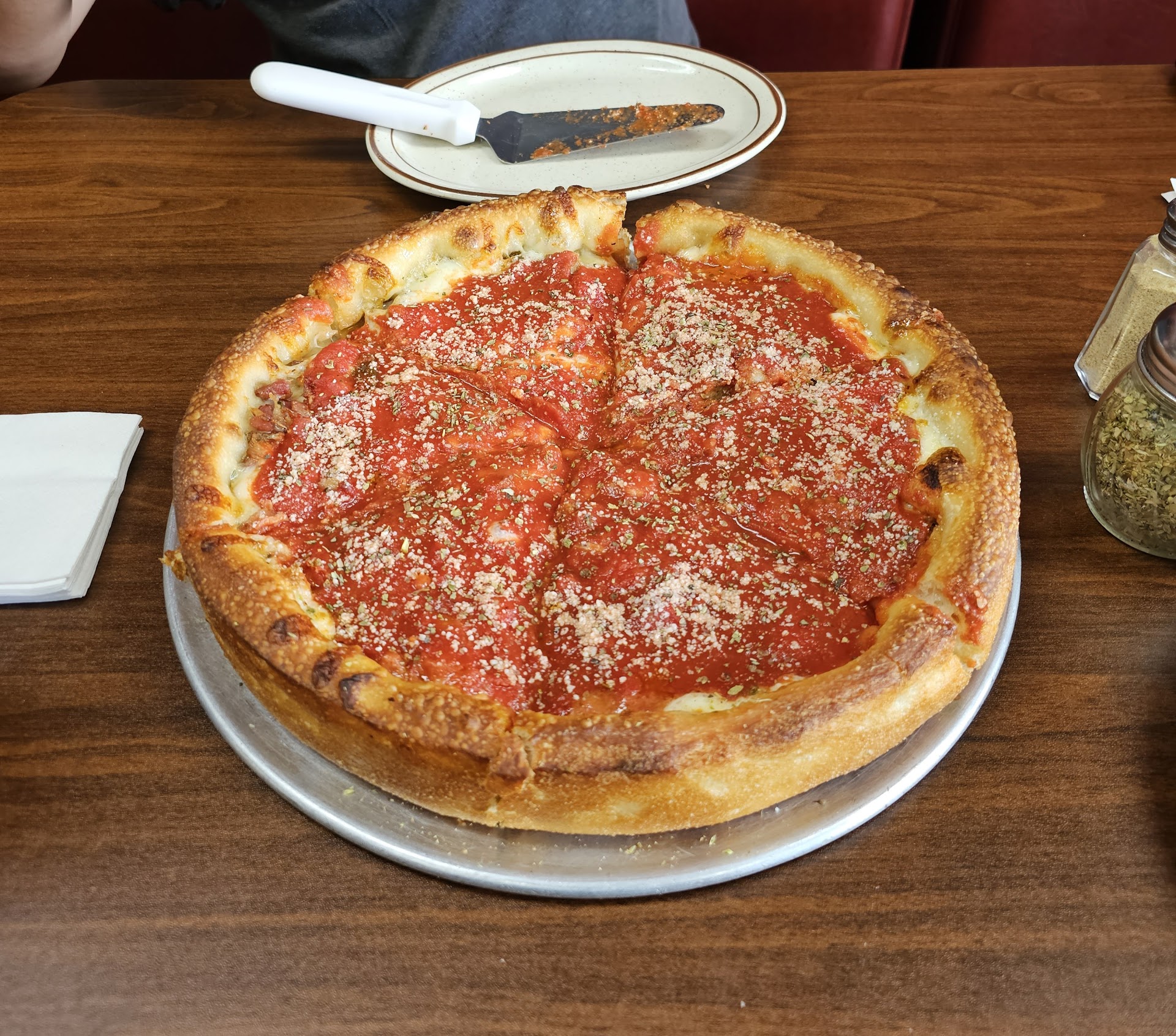 The guy behind the counter (not sure if he was the owner or the chef) welcomed us as we entered and he figured out immediately that it was our first time there. He knew we were there for the Chicago-style pizza. He offered us a menu and let us look it over. There are tons of options for Chicago-style and thin-crust pizza, but we were there for the Deep Dish! We ordered the Meat Lovers and WOW it was delicious. I never thought I would eat pizza with a fork and a knife, but it was a whole different experience than New York-style pizza.