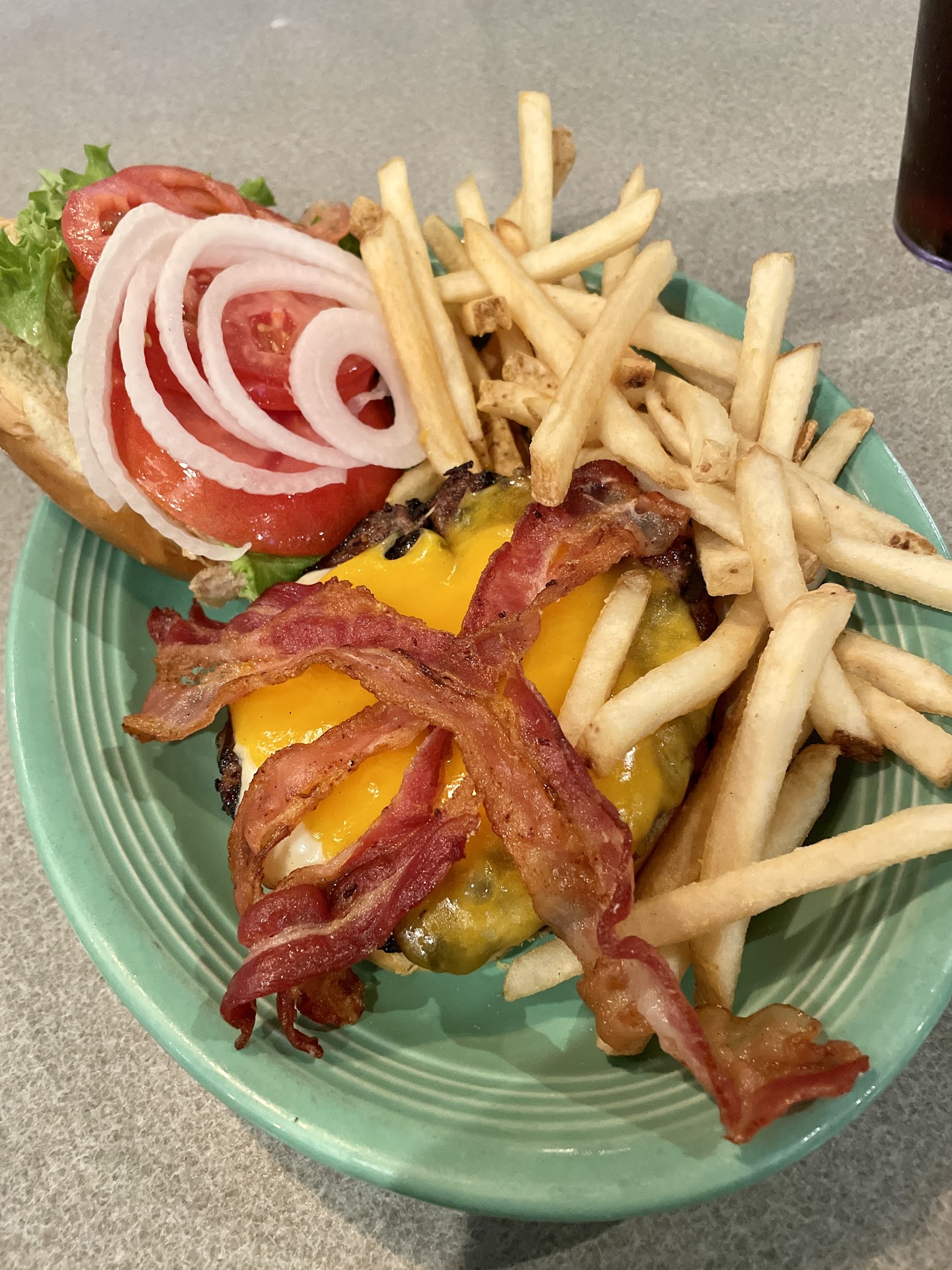 Stopped a little after 8pm last Saturday. Service was a bit slow and tough to find, for instance when our water glasses needed to be refilled. I had the Veal Schnitzel and the glazed carrots, which were a special side that night. This was pretty good! My wife had the "Angry" Prime Rib Melt. The idea behind it was good, but the prime rib was anything but tender and had a handful of good-sized pieces of gristle, not fat but gristle. She did at least enjoy the garlic spinach that she got with it. But we do not recommend their prime rib.