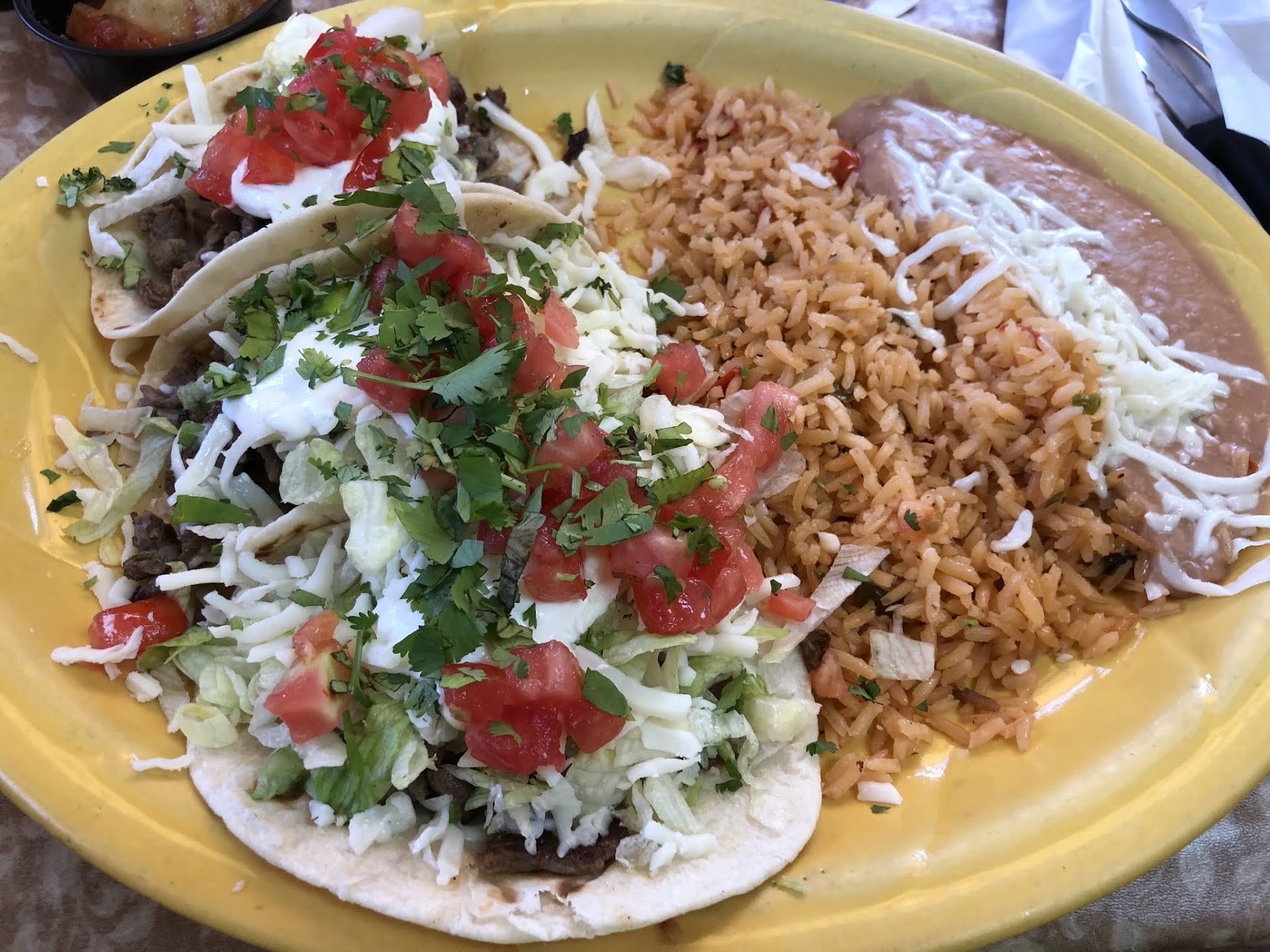 Read moreRestaurant review It only took 2 more years for me to come back to this restaurant. There are a couple of other restaurants now in town that can give this place a run for the money in terms of authentic mexican food. They have traditional pozole and the food appears to be home made and made fresh. I ended up getting the three steak taco meal with spanish rice and refried beans. I can't say that it was the best tacos I have had, but I think it was my fault for getting them with flour tortilla instead of corn tortilla. They are garnished well with ontions, cilantro, cheese, and tomatoes which goes well. They still give you the multiple complimentary salsa with tortilla chips which is a plus!