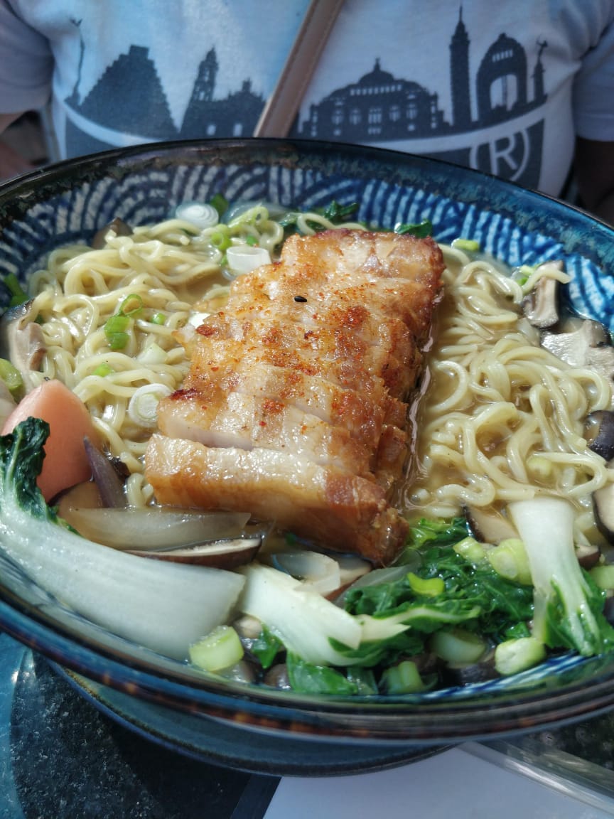 Steamed Edamame - steamed and salted perfectly, especially on chillier days and when you have the time to sit and chat while you enjoy them. Sushi - I enjoy the Coconut Shrimp & Mango sushi, and always keep one for after the meal, as dessert. Their $1 Sushi menu on Sundays, lets you have a couple of sushi rolls, of different varieties without having you commit to a plate. Vegetable Dumplings - quite crispy with a hot filling of vegetables and tofu. Miso Soup - this traditional soup from Japan had a toasty sweet-salty flavor, with soft spongy tofu chunks, and Sweet & Spicy Korean Chicken Wings, served with a side of Asian Coleslaw - The crispiness of the fried chicken is unbelievably ideal even though it is drenched in a sweet and spicy sauce. I always order with a side of white steamed rice, since it's technically a starter and I always try to make a meal of it. The Asian Coleslaw is superb and I've been craving it so much, that I have been recreating it at home. But they are always really nice about getting me seconds of the coleslaw. Pork Belly Ramen - A piping hot bowl of soup filled with all sorts of vegetables and Ramen noodles, topped with a brick of pork belly, that we always end up taking home in a doggy bag.