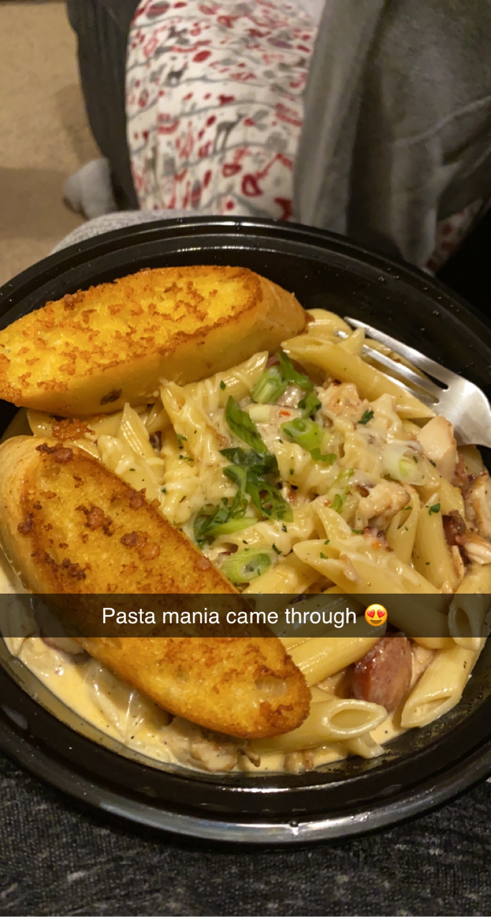 OBSESSED!! Went to Pastamania on my lunch break today. I ordered the Jambalaya that comes with bread and a cup of chili. I actually ordered extra bread because I love me some bread and ate my extra order on my drive back to work. This bread, this crispy, soft, moist, flavorful bread was so good it had me going back to the foil it was wrapped in and making sure I didn't miss any crumbs. I could feel an addiction forming. The bread was crispy on the edges, soft on the innards, and has a crispy cheese baked on top. The bread had so much flavor!! Once I got back to work I opened the chili, very well packaged and piping hot!! I was very impressed with the fresh ingredients on top with the melted cheese. The chili is perfection, a classic feel good chili, or at least in my opinion, it was perfect. The meat was tender and flavorful, the peppers, onions, beans, everything was cooked perfectly. Onto the jambalaya, I don't know how they cook their sausage but HOLY WOW it is amazing. The flavor, the texture, everything. The chicken, even though a bit dry, was packed with flavor and because of the sauce still very good. The noodles and peppers were the perfect consistency and every ingredient compliments the next, all so well prepared and cooked. The man who took my order was very kind, very personable, and brought my food to my car since it was so cold out! Even the portion sizes are great, this one meal will probably feed me at...
