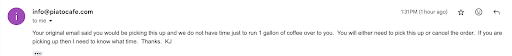 Read moreI had a disappointing experience with this coffee shop recently. I originally placed an order for coffee with the expectation of pick-up, but later reached out to see if delivery was possible. The response I received was shockingly rude and dismissive. The employee (KJ) responded with: "Your original email said you would be picking this up and we do not have time just to run 1 gallon of coffee over to you. You will either need to pick this up or cancel the order. If you are picking up then I need to know what time. Thanks. KJ."