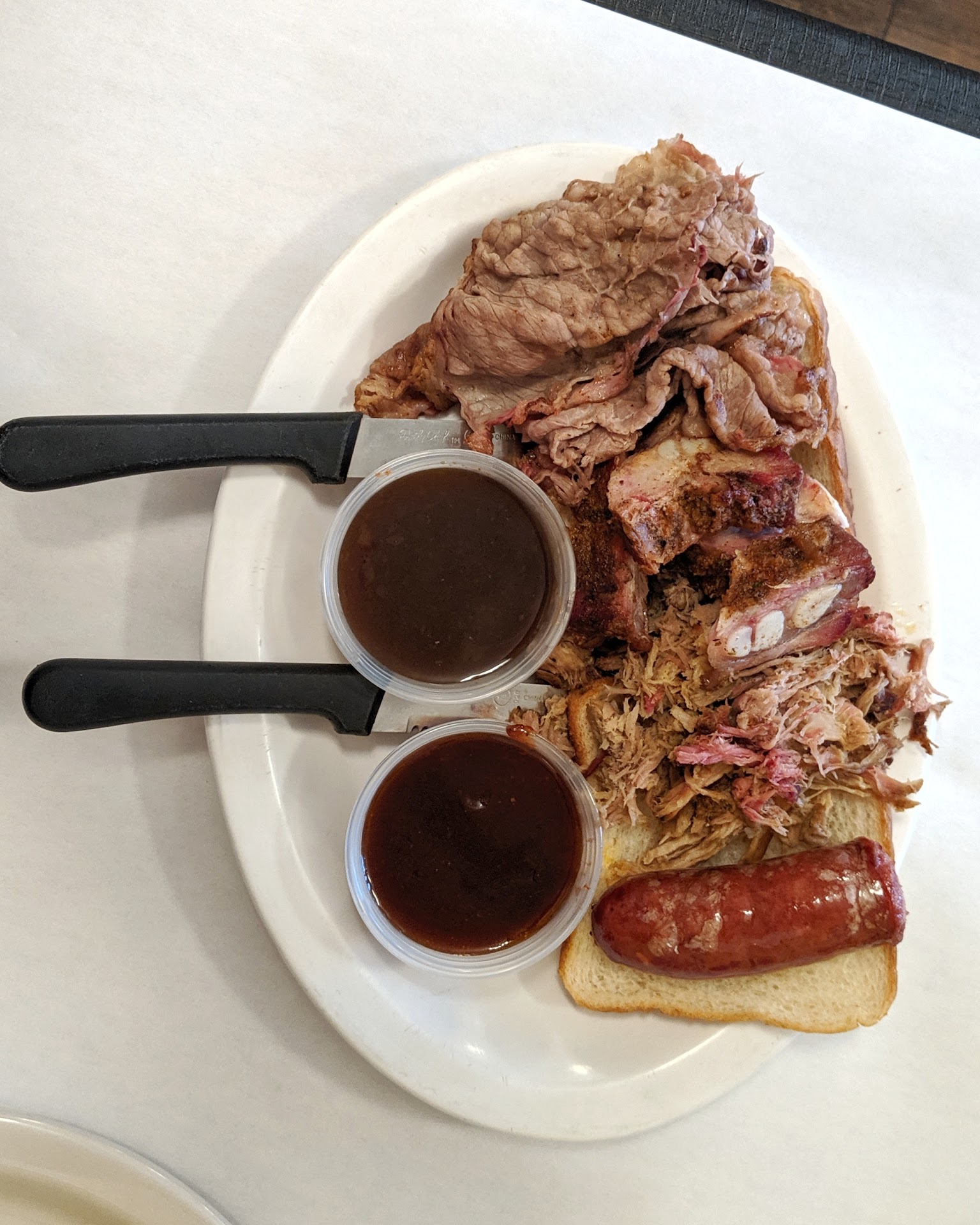 The pizza is a big menu item, but I had the BBQ sampler. It is a large platter piled with meat and two slices of bread. Generous portions and high quality meat cooked expertly made for a very satisfying dinner.