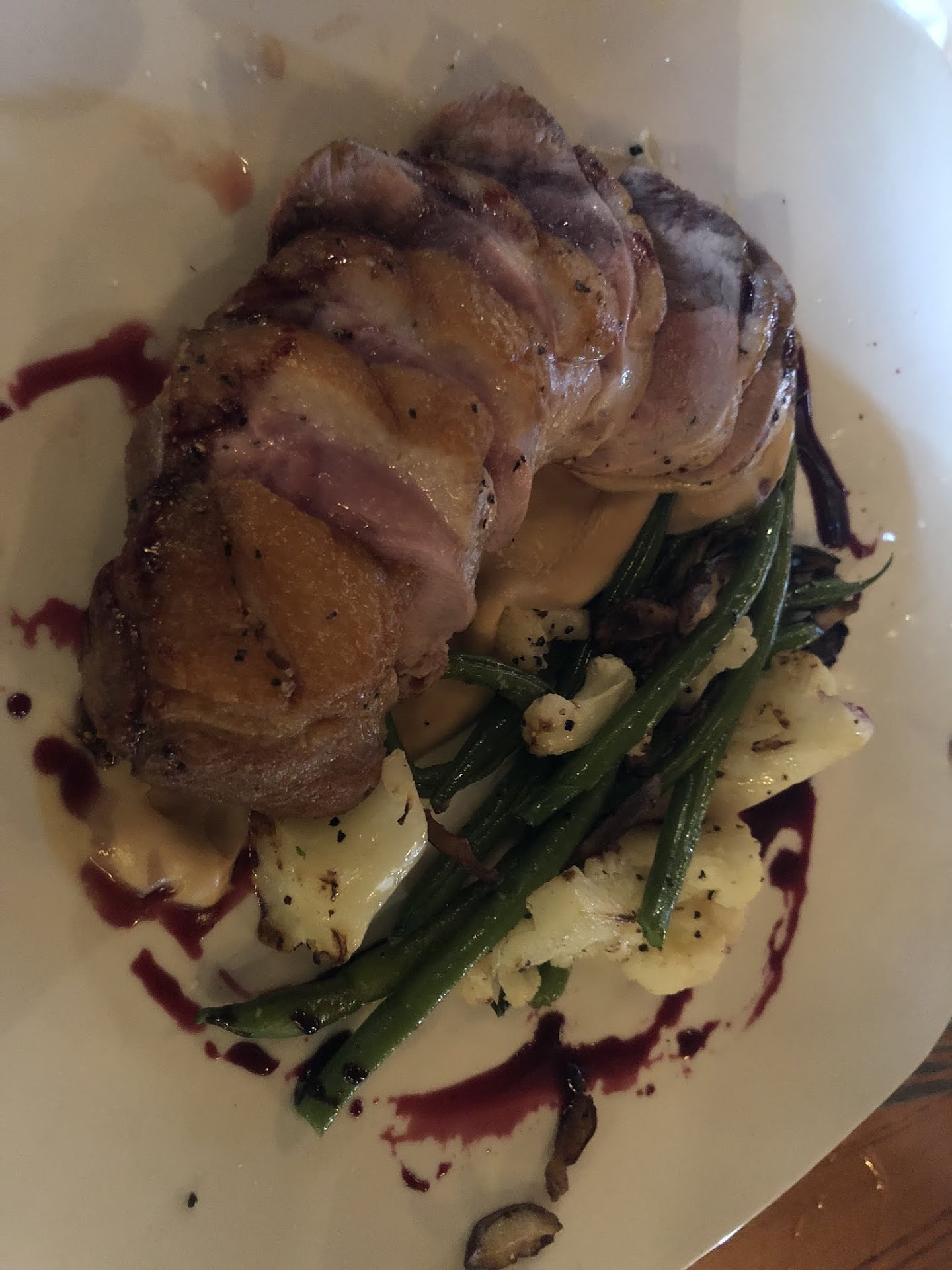 Read moreRestaurant review Being 2.5 hours away from Chicago, I am still looking for a great modern America cuisine restaurant that is not simply a steak house. Silvercreek is likely the best that Champaign has to offer, but it still falls short of a 4 or 5 star dining experience in Chicago. As soon as you step into the restaurant, the all brick wall and wood ceiling interior adds a bit of class to your meal. We went in the summer time, but I can imagine how rustic it would feel in the winter with the large fireplaces that are along the adjacent wall. The server was quick to take our orders and get the kids meals out first with the appetizer. We went with the appetizer sampler which had the shrimp cocktail served with blue cheese mousse with cocktail sauce (FYI they serve it in such a weird shot glass that I thought it was an oyster in cocktail sauce....), calamari fried exceptionally well, marinated olives with a sweet zest, and duck prosciutto wrapped dates. It was nice trying a bunch of apps on plate. My duck entree is where it losses some stars as only 3/4 of this was cooked well, the other 1/4 was too well done on the chewy side. The cauliflower and parsnip puree along with the shiitake mushroom roasted cauliflower complemented the dish well especially the freshness of the vegetables. I am also very concern why there was a dark blue discoloration in the duck breast as noted in my picture. The redeeming quality is the extensive options on the menu and some farm to table elements.
