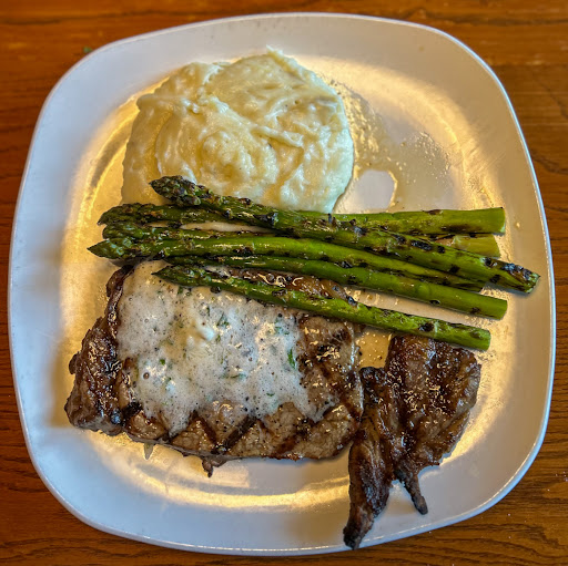 I ordered the Macadamia crusted Halibut served with a cream saffron sauce, garlic mashed potatoes and asparagus. The fish was cooked well but bland and a little underseasoned to my taste. I asked for the saffron cream on the side but it was not too rich or creamy. I was satisfied with my meal.
