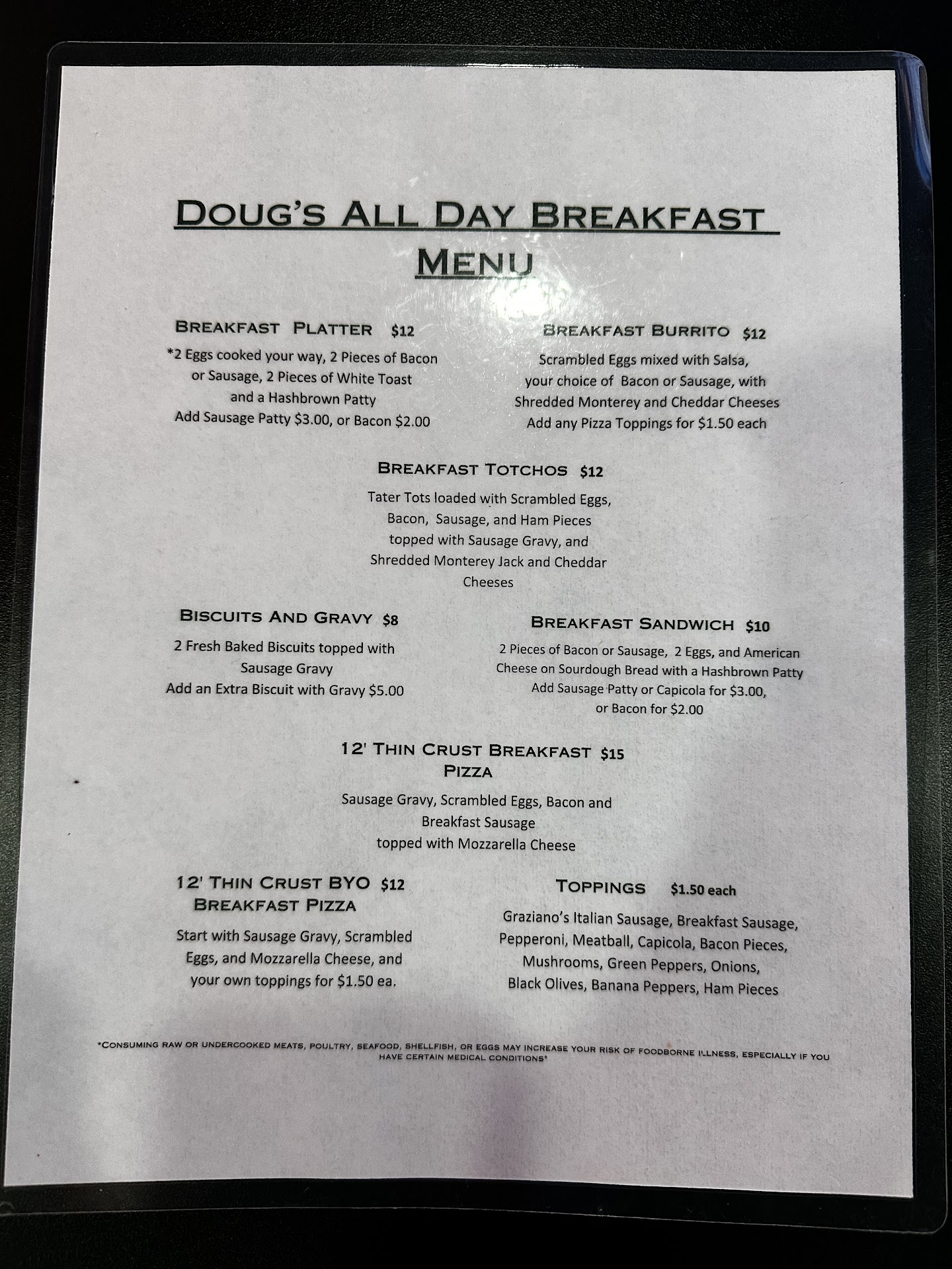 After passing a "Breakfast All Day" sign, we decided to stop in and give it a try. It was around 10am on a Saturday and the place was mostly empty. Service was excellent and fast. We had the standard breakfast (eggs, meat, hash brown and toast) and the Breakfast Totchos (tater tots with egg, cheese, gravy and meat). The Totchos are something we don't see at every place we go, and they were excellent. Most breakfasts are currently at the $12 price point.