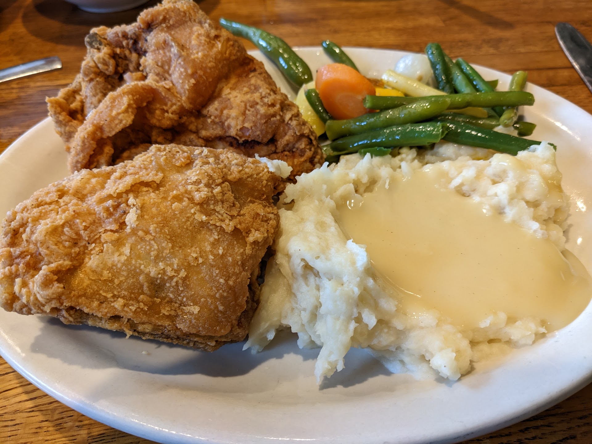 Read moreWe hadn't been here for a long time, but decided to try it again. It was not busy when we arrived. The hostess was friendly and efficient. The server moved like a sloth, kept checking his watch, and acted like it was an imposition to wait on us. I said I had weight loss surgery and forgot to ask the hostess for a kids menu, so he went to get it, which took several minutes. He brought it to me, I glanced at it, he didn't even ask if we needed a few more minutes (which we did not), was gone almost ten minutes, finally came back, then was very abrupt when answering a simple question about the kids meal. Then he asked for my weight loss card, took it from me, and disappeared for five minutes. Rarely am I asked for it, but I'm happy to show it; however, he grabbed it from me and didn't return for five minutes, saying he had to get approval to give me a kids meal. When I asked about drink choices (that the menu said was included), he rudely said I was an adult and it was for kids and I shouldn't have asked about drink options and that he would charge me extra for it. I said no thank you, I would drink water (like I usually do anyway). My kids meal chicken strips and fries ($6.99) were hot and very good. The country fried chicken meal my husband ordered had a lot of food and extras (it should for $16.99 on a lunch menu). He loved most of it, except the mashed potatoes he said were blah. Afterward, I tried to quietly discuss the server issues with the front-end manager. His eyes pretty much glazed over and he said next time I could just request a different server. Really? The idea was to let him know what happened so maybe they could coach him on proper customer service...
