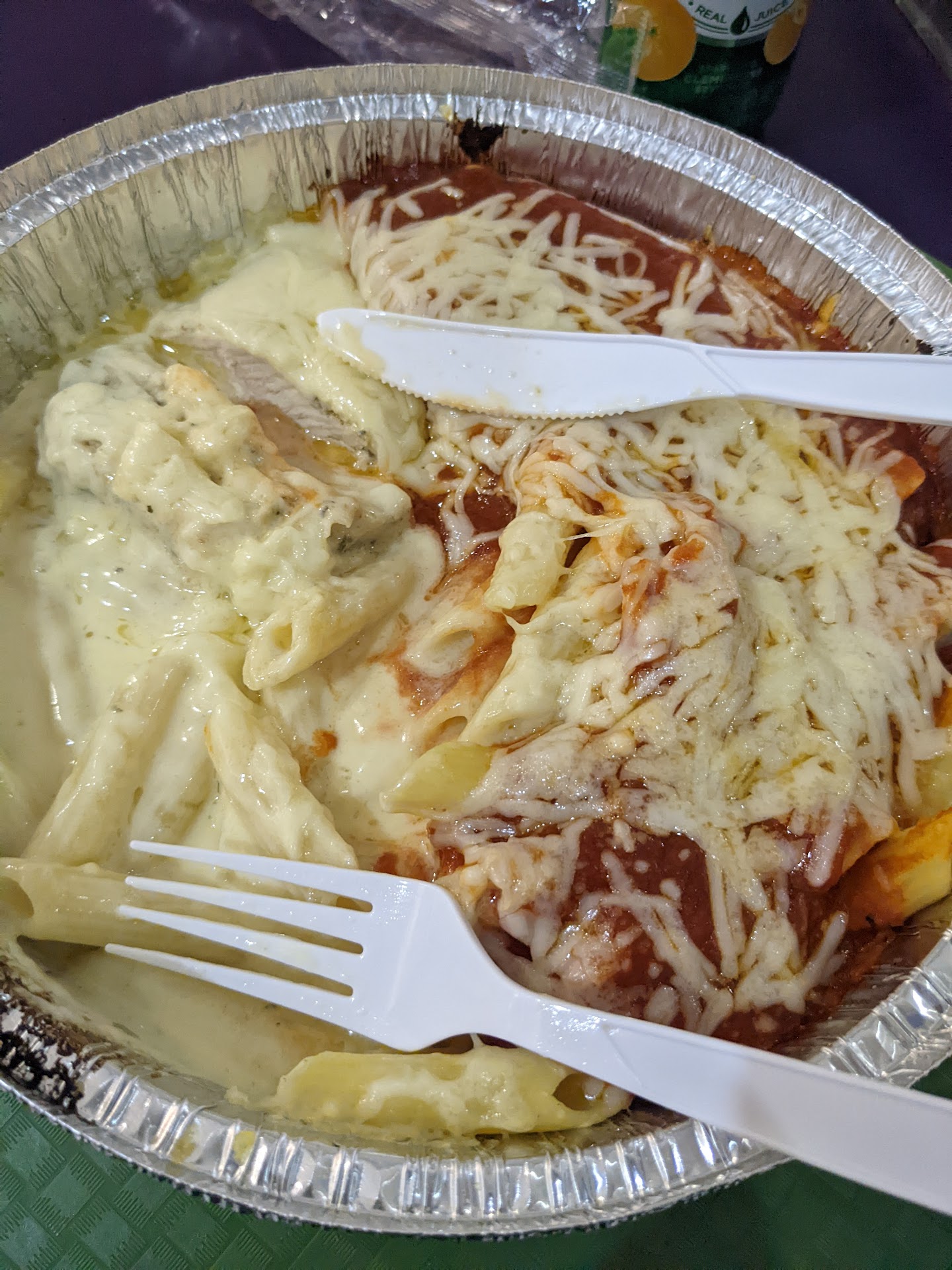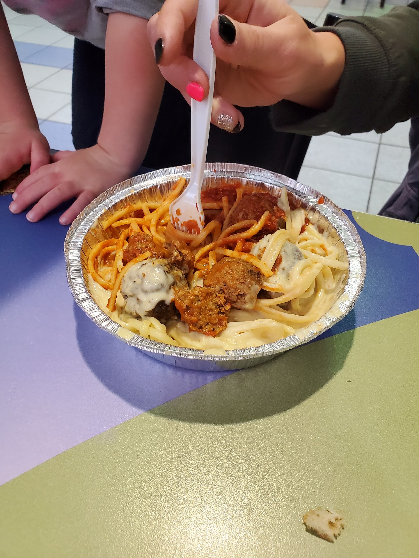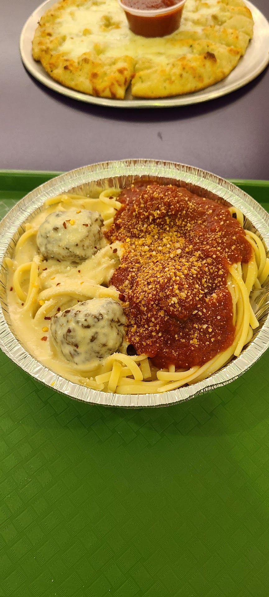 Ordered a piece of pepperoni pizza, linguini with meatballs and 1/2 red, 1/2 white sauce, and garlic cheesesticks. And 2 pops.