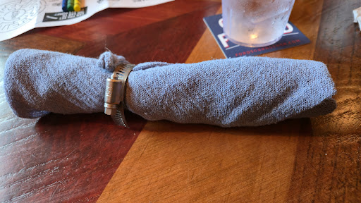 ATMOSPHERE: Take a Texas Roadhouse and theme it like an automotive service shop. It's loud when busy, so loud I had to yell to talk to my group. This was during the busy dinner time, but the place could definitely benefit from some strategically places soundproofing. They take the theming to a cheezy level; instead of napkins you get shop rags that are clasped by a hose clamp. Charming.
