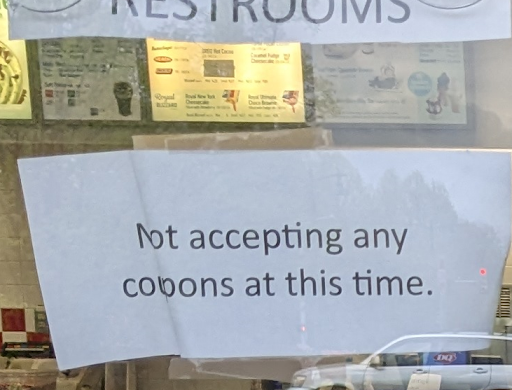 Disappointed that this DQ no longer accepts any coupons. I live local, visit this store occasionally, and had a coupon. But when I wanted to use it, the store manager politely said he does not accept them anymore. I did not ask why, but he pointed to the homemade sign on the door and told me about how these cut into his profits, and how corporate should do coupons in the winter when he has less visitors. This is so self-defeating, spiteful and petty. I understand his logic, however he has forgotten that the majority of his customers are like me. They are local, and will likely return again with or without the coupons. Is the few extra pennies in product cost to honor the coupon really going to break you? I know that the extra dollar he gained yesterday will lose him future return purchases tomorrow. No wonder he is complaining about his profits. I like DQ, and will return sometime again soon, but the next time I've got a craving for ice cream, I'll probably walk to Freddy's or...