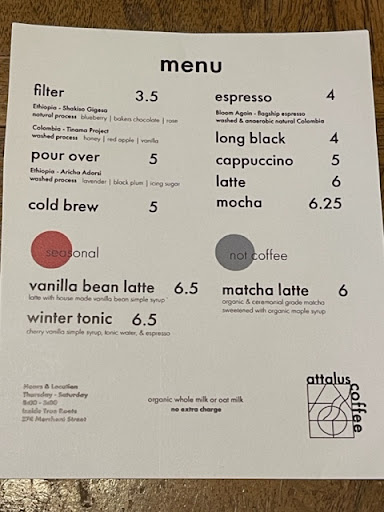 Ā Ā Ā Read moreWow! What an amazing coffee!! The best way I can describe good espresso drinks (latte, cappucino, etc) is chocolate-y. Not the same flavors as chocolate or sugar, but soft and nuanced. Unfortunately, most coffee houses use dark roast coffee which produces robust bitter flavors, but eliminates the complexity that results from light or medium roasts. I am a regular Temple Coffee (Sacramento, Davis) customer, and Attalus seems just as good- which is excellent. It's a whole level above Peet's and Starbucks and requires professional training. I had a cortado with oat milk. I haven't tried the other coffee drinks like pour overs, so this is a limited review. Other stuff: Attalus has lots of windows so the seating was sunny and a great place to hang or work, outdoor seating was cute, the service was friendly, but I don't know if they have wi-fi. They were also serving food which looked and smelled great (the patron next to me had a gorgeous pancake thing with loads of fresh fruit, but I didn't see it on the menu.) They are only open Th-Sat 8-3 and don't have a window sign yet. They share space with True Roots Juice and that is the sign you will see from the street. Street parking seems dicey but there is a public lot 2 blocks away at 300 Davis St. Tap on the picture to see the full menu. I hope they open more days per week because I want to come here more often. This place is...