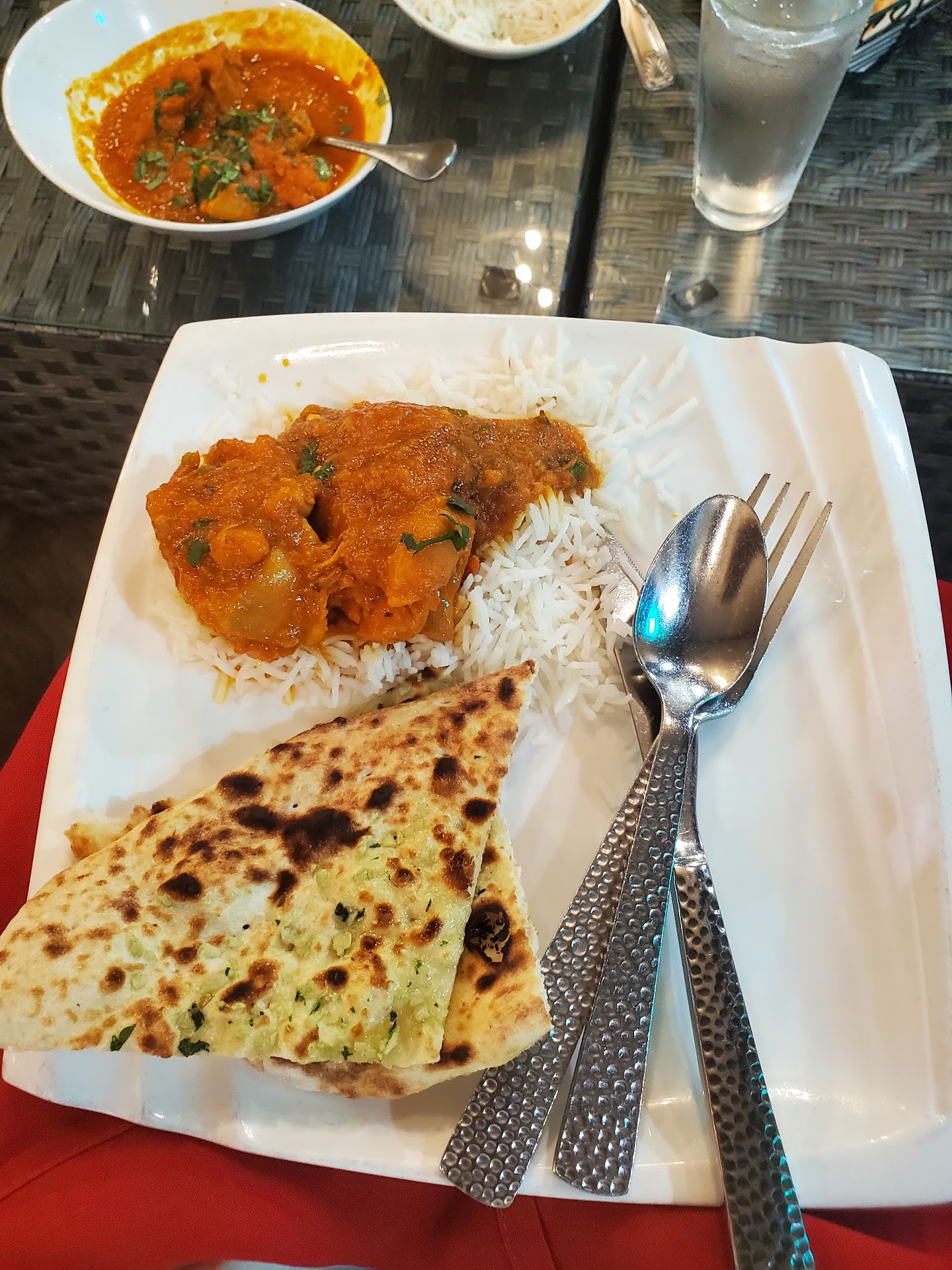I started with a mango lassi, which was thick and creamy with the perfect sweet-tart balance. For my entree, I ordered the chicken curry, which had tender pieces of chicken in a rich and savory tomato-based sauce. It looked more like masala to be honest. The garluc naan bread was freshly baked in the tandoor oven and arrived piping hot at my table. It was so buttery.
