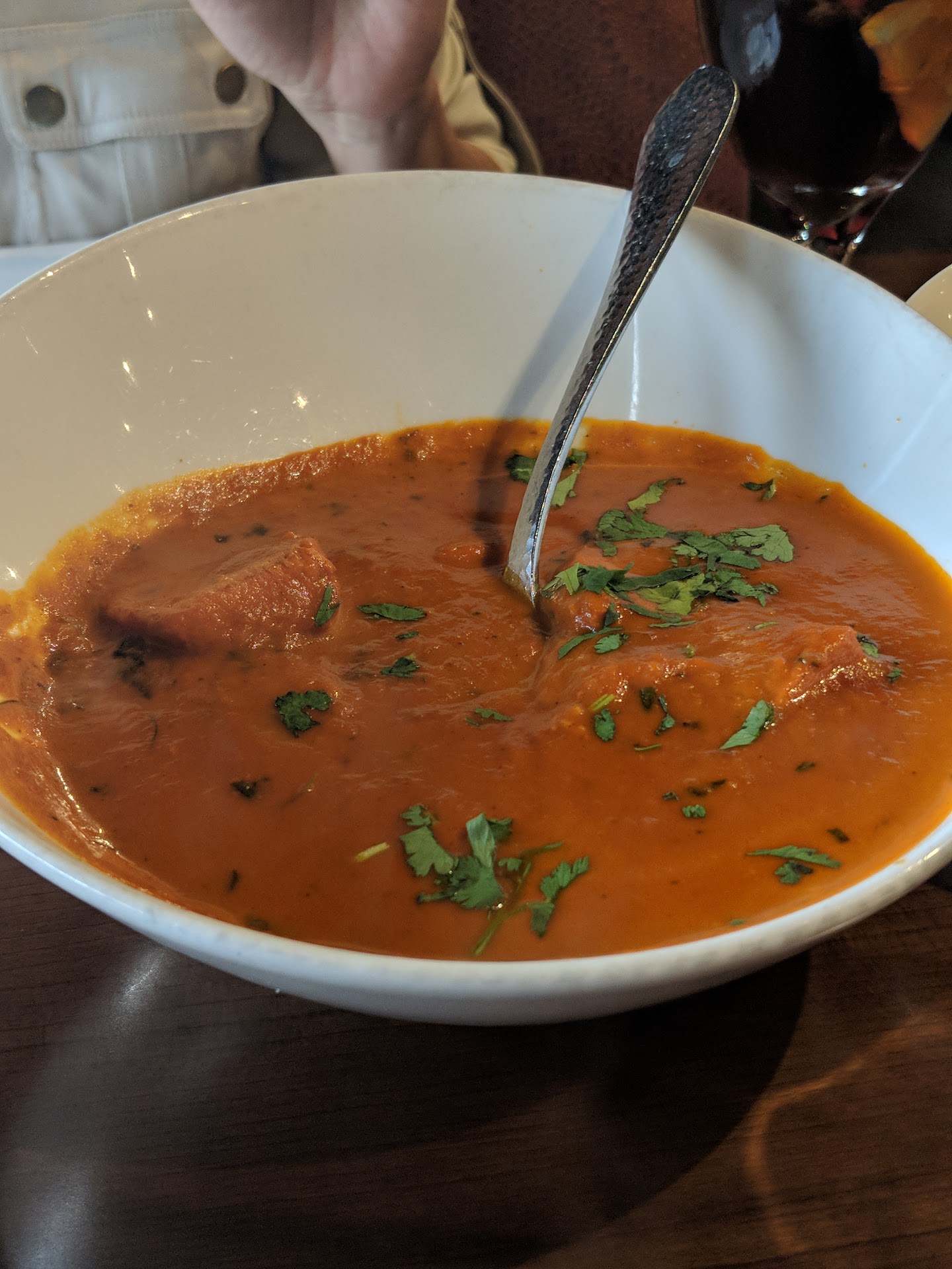 I dined on the patio on a rainy Friday evening. The patio was entirely empty, so I had the space all to myself. The restaurant had lit up the outdoor fire lamps, which provided warmth against the dreary weather. Soft Indian music played in the background, lending to a serene ambience.