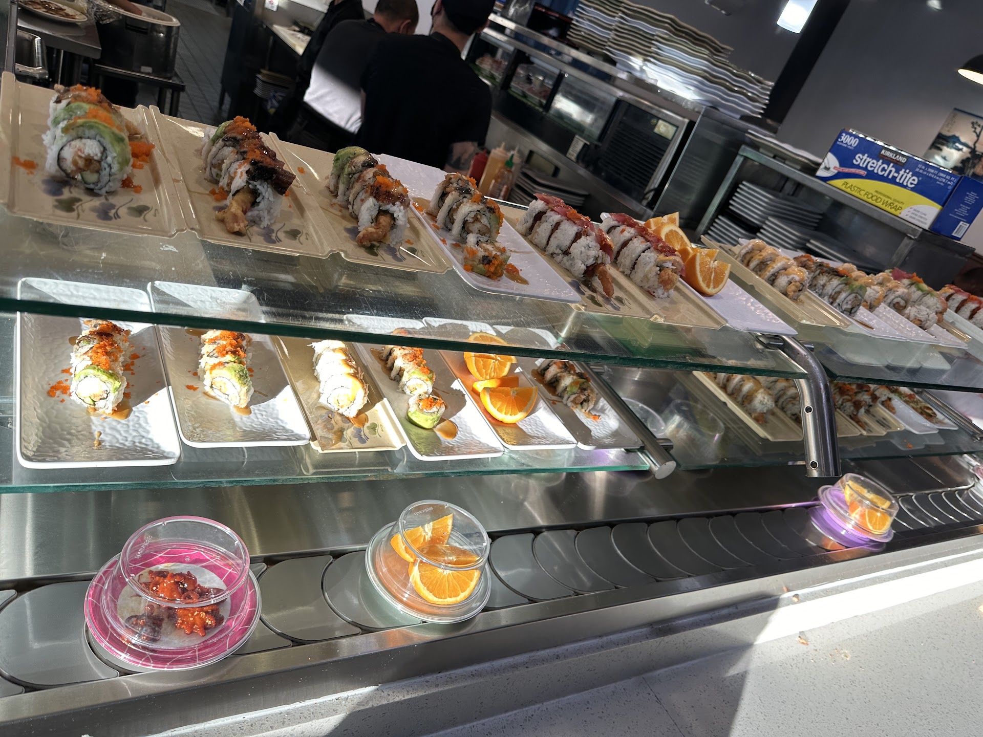 Read moreIf you like food with flavor and good service, please, stay away! Over priced and underwhelmed. Please read on if you want the dirty details... Went for a Friday night date night with hubby. The reviews were wonderful and we were excited to try a new place. Arrived early as the reviews mentioned lines. The restaurant opened promptly at 5pm and there was already a crowd. I thought this was a good sign (I was wrong). We chose to sit at a table and a server took our drink order and I asked about the menu as it was our first time there and wasn't sure what was on the rotating buffet and what needed to be ordered via server. She was abrupt and unkind in her answer. Some rolls need to be ordered and some are on shelves above the rotating buffet. You order the appetizers from the many servers meandering throughout the restaurant and some have tablets, some don't. We ordered appetizers and went to the rotating buffet. Found some items and sat down. My husband's appetizers showed up. Mine did not. When we inquired again and I finally received my seaweed salad it was as though chewing petrified hay that had mated with Easter egg basket grass and left out to pertrify in Death Valley for good measure. Then still had to ask them again and again for everything else we ordered from the shrimp and veggie tempura to the soft shelled crab, fried oysters, salmon, was bland and oily. The only taste was oil and batter. The sushi rolls were on par with Walmart. Although with Walmart at least you know you're choosing trash. The restaurant seems to not have any salt on hand as even the edamame (which on the menu says "lightly salted") had NO salt at all. Orders from the servers repeatedly did not arrive and the air was not on. It was extremely warm and it was already a late, hot, summer day. The oysters, which I was truly looking forward to were sticky, slimy and uneddible. For $56 I could have made dinner at home myself and saved me from (embarrassingly) vomiting in the parking lot while onlookers cringed. And yes, it tasted just as bad if not worse coming up. Dine at...