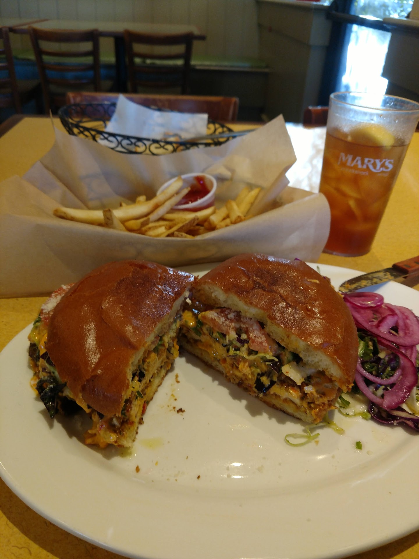 Read moreI had heard mixed reviews about Mary's, so I wanted to give it try and see which was accurate. It was dinner time, 6:30 ish and almost to capacity when I arrived. I was seated by the manger, or it felt like a manager. The restaurant was clean, with table protocol's in place, and all the staff had their masks all on. I decided to try their limited time Chicken sandwich, with a side of fries. My waitress was friendly, cordial, and polite. Served warm bread and butter, along with an ice tea. Chicken sandwich arrived promptly, was hot and just as advertised, lots of sauce and tasty. All in all I had a very nice expierience and will return to try the chicken parmesan at a later date. Staff was friendly, restaurant was clean, food was prepared well, and decently priced, and very generous portions. Their menu has many options to chose from, so I would give them a thumbs up and say give them a try if you are in the area. Bon appetit, and until...
