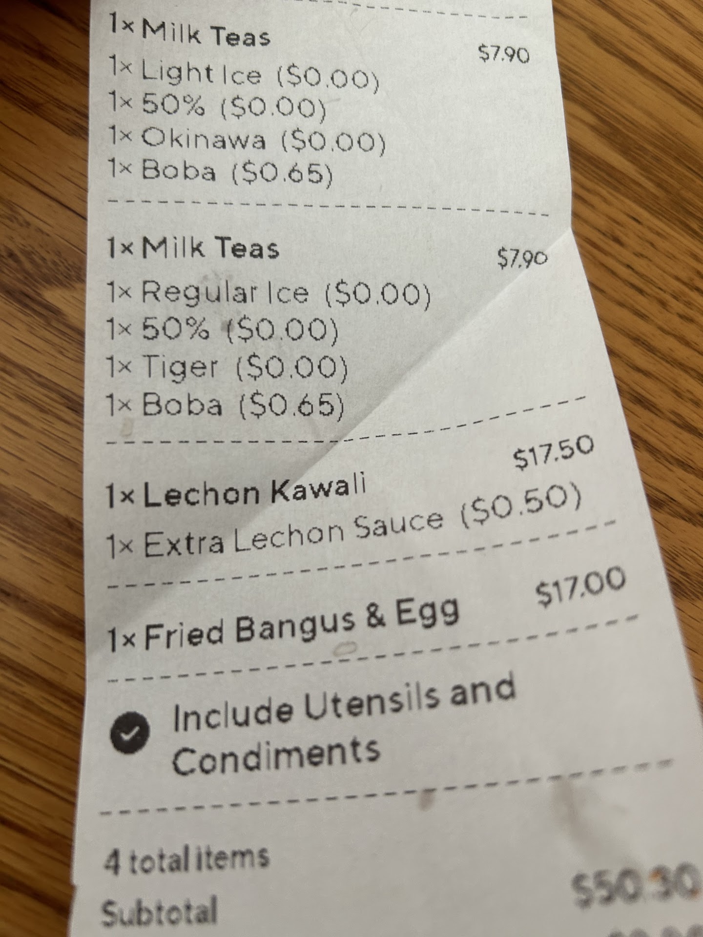 I do like that their menu incorporated some dishes and a variety of snacks to try and more than being just a boba store. Their boba is alright, wasn't outstanding but it did satisfy my palette. I am a bit disappointed with their cups. I do believe what marks a good boba store is how the cup or at least it's cover is designed but it rather feels generic whether it's for the sake of saving money or so, the look of the cup Is a trademark worth investing into. Tried their sinigang wings and as much as I love sinigang in on itself, the flavor profile doesn't seem as prominent being on a chicken wing, don't get me wrong it is ok and a welcome flavor to try that's for sure but it's not a flavor I'd be putting in my top 5 wing flavors. Popcorn chicken is good but so I may just stick with that next time. I would like to give the guy behind the counter some props for being lively and accommodating and so Is the staff. Overall neat place, not the best but im hopefull they will magically improve...