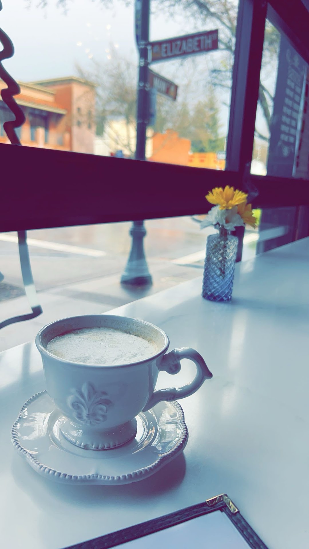 Read moreIt was about 2:02pm they were barely opening. Taking down chairs and there was a rowdy party of 5 or so waiting to sit. I love the design of the place. The furniture is unique and pleasing to the eye. They were ready to serve me a drink already. I declined & chose the cappuccino. It was fair. I loved the tea cup vibe. Oh my goodness the clam chowder is amazing. It hits the spot for sure! Wanted cheesecake but they were fresh out (someone else came in to order it too). Kinda disappointed about that but I’ll be back to try again! I hope they weren’t upset because I used...