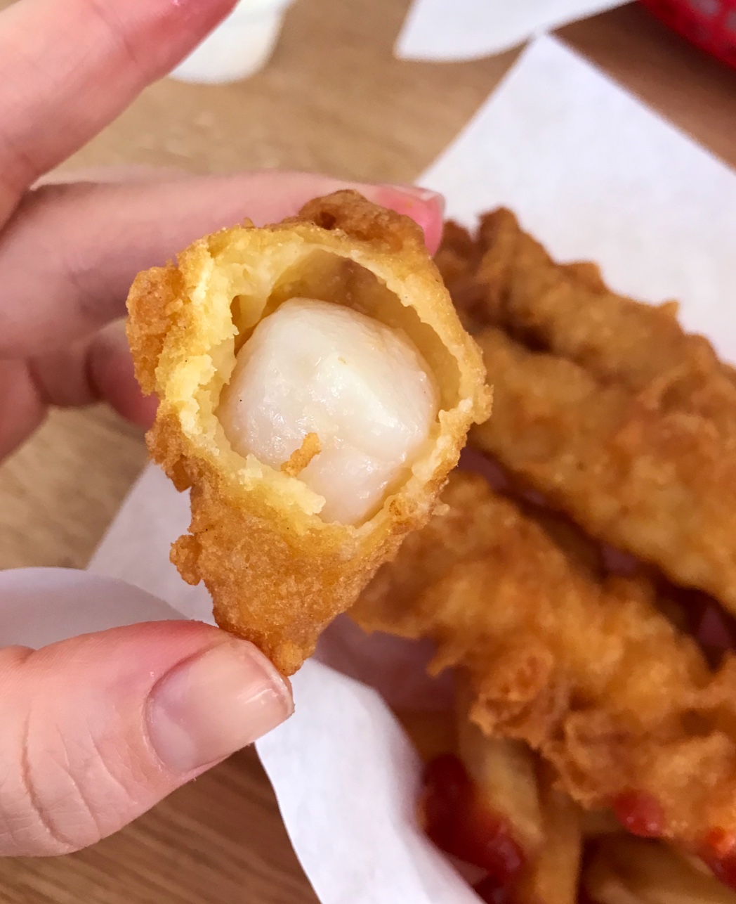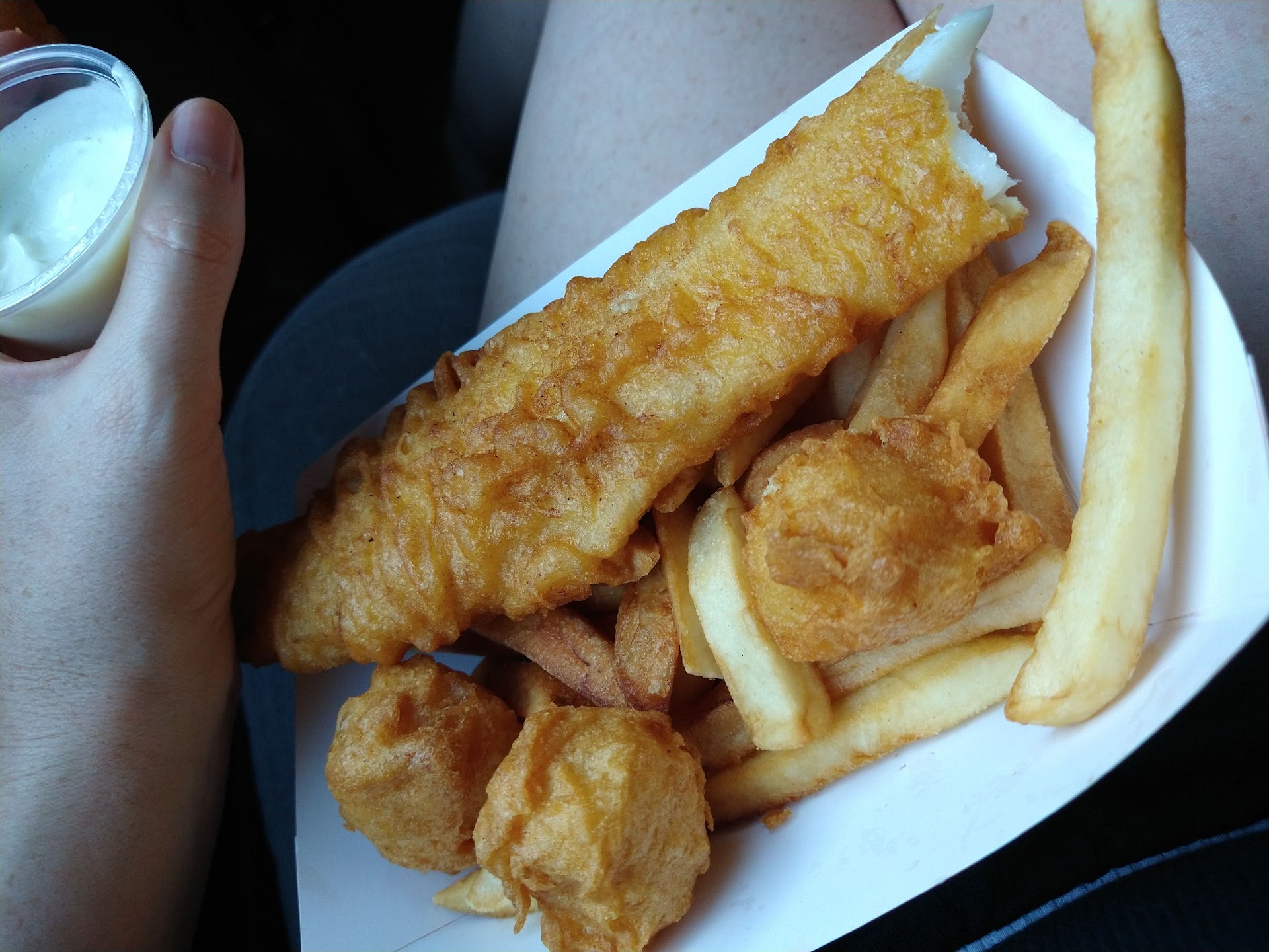 I can pretty much say that the actual fish was āmissingā on the 3 piece fish and chips combo. There was so much, and I mean, SO much breading that I ended up peeling off the crust and ate whatever trace of fish I could find; The sample plater was not any better. The shrimp was ok, oysters had a very salty taste, as in not properly cleaned. The scallops⦠well, look at the pic. Even the ketchup was off. It was kept in the fridge for who knows how long and when it was brought out, it was sticky like a fruit preserve.