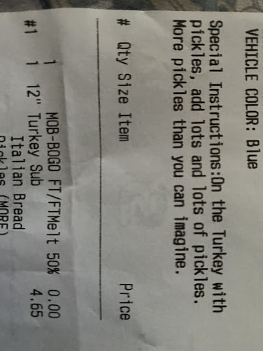Did curbside pickup today, I ordered a Turkey sandwich with just pickles, I made a note on the order saying I want lots and lots of pickles, as seen in picture below. And I did not get that whatsoever. It was hardly any pickles. I paid $9 for a sandwich with just little pickles and lots of Turkey. Then I also ordered another sandwich, which I got toasted and the cheese was so over cooked it was practically burned and not a lot of steak on there either. On both sandwiches the bread was so hard, it tasted like stale bread. On the last sandwich, there was hardly any steak either and the cheese wasn’t cooked. Usually they heat up the cheese with the steak even if it’s not toasted. Not impressed whatsoever and will not be returning to this...