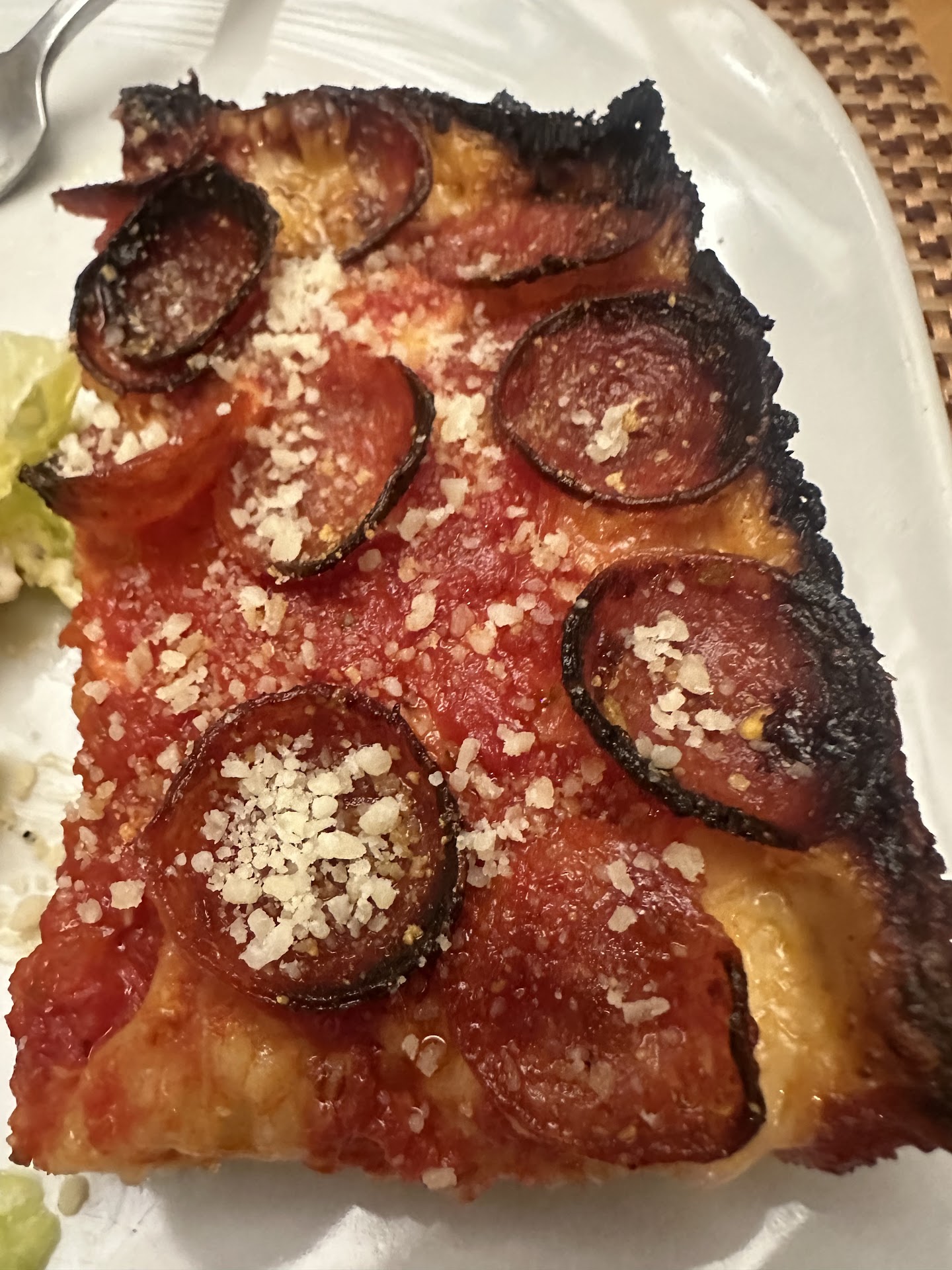 Ā Ā Ā Read moreThis place is great. This isn't a knock but the only seating is outside. They have a bit of counter spots inside but it's super tight. Plan accordingly if it's cold. If it's on the warm side, nice to eat pizza outside in Vail. FAR MORE IMPORTANT is the food. This is detroit style pizza (not sicilian). They don't have NY style. Just detroit. We love detroit pizza and have had it at some really good spots. This stands up. The crunch is great, the sauce is great. We got half plain half pepperoni and all four us were disappointed there wasn't more when we finished. We had an ordering fail. That's on us. In fact we are strategizing our ordering right now for dinner so we don't feel like we missed on ordering. It's just so freaking good. We ordered brussel sprouts which seems like a really odd thing for a pizza place. These are easily top 3 brussel sprout dishes I have ever had. They cook them really well, so they aren't like eating a baseball and the flavor is just elite. Hot honey and parmesan. They are simply perfectly done. They have wings which sound great (we don't eat wings). We have eaten at Blue Moose for years. This is a totally different speed and for us, better. can't recommend...