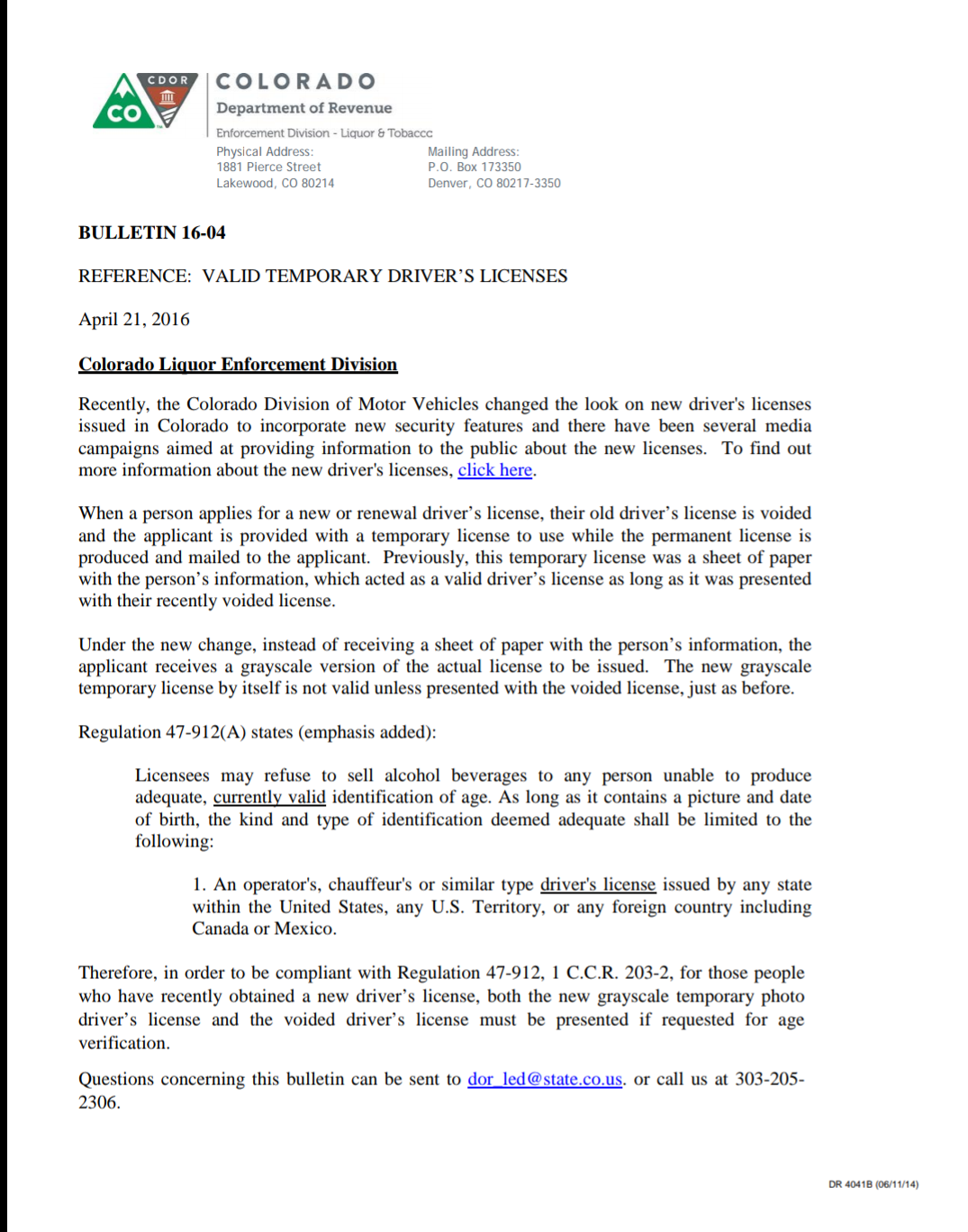 "Therefore, in order to be compliant with Regulation 47-912, 1 C.C.R. 203-2, for those people who have recently obtained a new driver's license, both the new grayscale temporary photo driver's license and the voided driver's license must be presented if requested for age verification" (information easily found on Google)