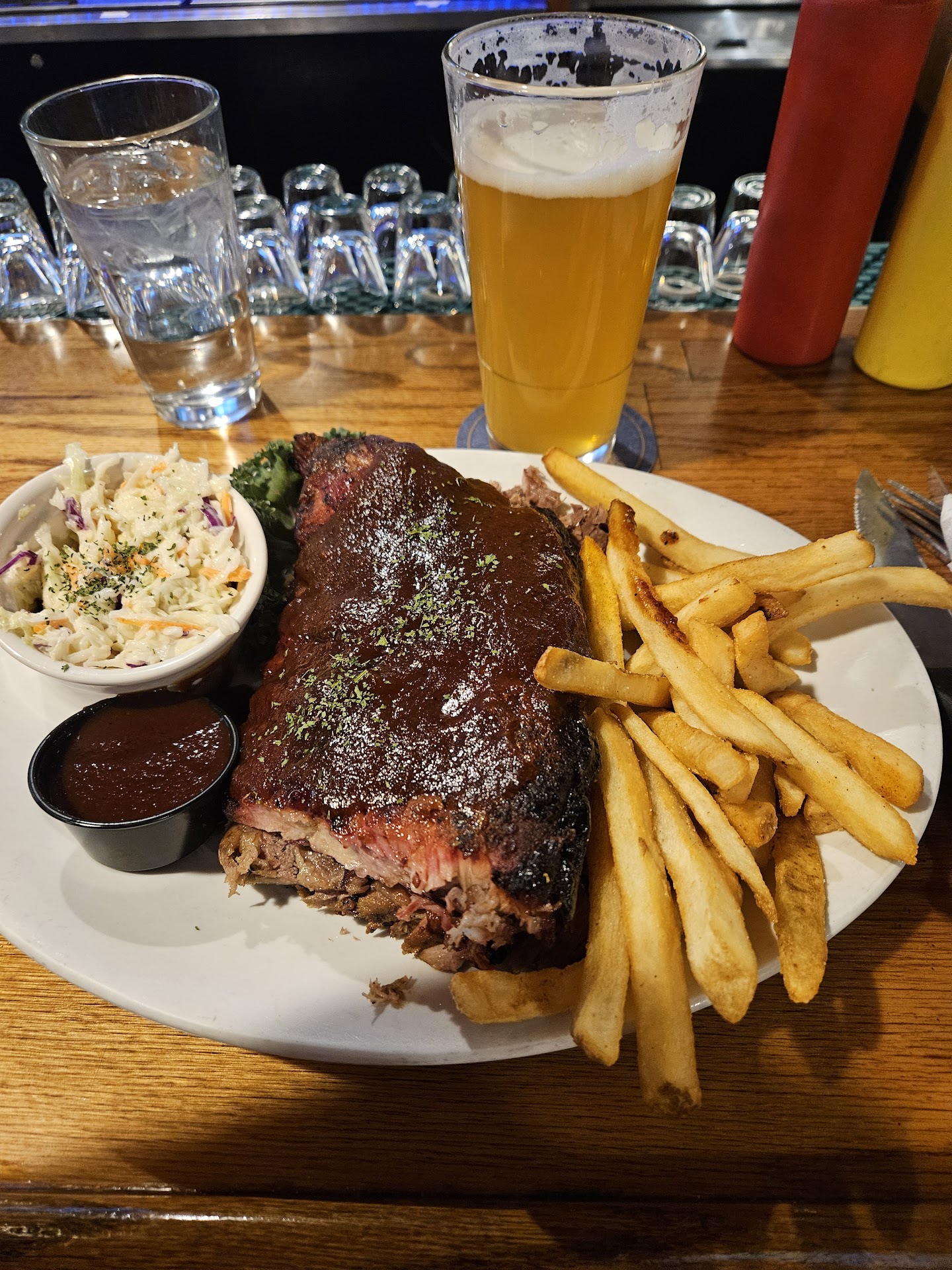 My wife and I just got into Vail this afternoon. We were tired, hungry, and REALLY craving a good old fashioned hamburger after seeing an advertisement in IAH for a burger restaurant in the terminal. We got checked in, unpacked, walked around the Village and looked for a spot to eat. We decided on Red Lion and we could not have made a better decision. Those hamburgers we had were without a doubt, in the top 5 burgers we've ever eaten. Being that we live in Houston, which has it's fair share of amazing hamburger joints, that's a bold statement in my opinion. However, it's the absolute truth. Flame broiled to perfection, however you want it. I had Medium and my wife had Medium Well. The meat was incredibly flavorful, yet simplistic. No fancy seasoning that we could taste, just 100% pure beef with maybe a dash of salt and pepper. The potato bun was perfectly portioned and added just enough bottom bun to prevent the toppings from dripping down one's arm. In total, the bun was just big enough to keep everything in without overpowering all the other flavors. The pickles were thick cut, homemade style pickles with amazing crunch and flavor. Lettuce, tomato, and onion all garden fresh. We both had one slice of American cheese, but I doubled up and added a slice of cheddar. We both added bacon, and that bacon was crispy but not burned and had superb crunch and flavor. Onion rings were hand-battered and had excellent flavor, and the shoestring French fries were hot, crispy, and salted just enough.