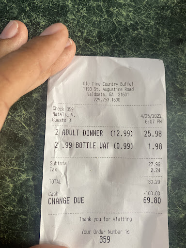 Read moreFor a first time visit I was so disappointed and disgusted. I was excited when I saw the parking lot full and smiling faces. Our waitress extremely nice and welcoming. So began plating our food and that is when the hairs stood up on the back of my neck, my stomach began to turn, and I wanted to toss the entire buffet line in the trash and tell everyone the food was contaminated and that they should run for their lives. I noticed a spoon fully submerged in food pan on buffet line, we waved an employee assuming she would replace the entire pan… The staff came over while eating a cookie, placed the cookie down and without gloves she retrieved the spoon with her bare hands. She then placed a clean spoon in the pan of food. I then asked her, “are you not going to replace the pan”, she responded, “huh”… I repeated the question and informed her that the entire spoon was just in the food… She then with an attitude, asked her peer to hand her a pan… and she did the unthinkable, she poured the contaminated food into the new pan and then placed the contaminated food back on the buffet line…The employee did all of this in front of me and the other customers. Unlike them, I no longer wanted to eat from Ole Times Country Buffet… I envisioned chef’s in the back mishandling food and wondered how many more spoons fell into food… I completely lost my appetite. I immediately asked for a manager who apologized and attempted to make things better but the damage was done. I told her how disappointed I was and how it was a suggestion to stop here. As first time customers this was not a good impression. we were fully refunded our money. I made sure to tell the manager that the waitress (I think it was Michelle) was extremely nice and we made sure to tip her. I really hoped the manager would quickly remove the food item from the buffet but she did not but she assured me should would do so. The manager also suggested we give them another try but I doubt I can. The food service department should assess this restaurant more frequently… I’m pretty sure food there are so many violations happening… I cannot recommend anyone to eat there no matter how good people say the food is, food preparation and handling is...