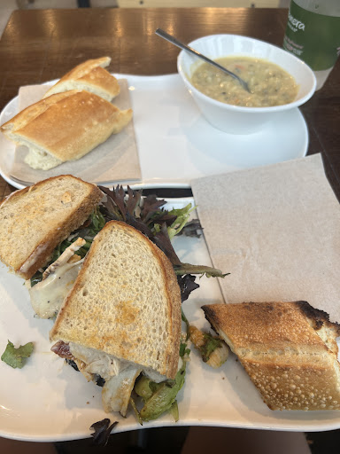I am typically not one to say anything but given the fact that I worked at Panera for 4 years and know the expectations and standards of the company I was disappointed with my experience…which let me mention I was hesitate on coming here. It has been 6 months since I’ve worked for the company and yes some things change but I doubt the standards have changed in 6 months. Also to mention I am pregnant and sick, so I was really looking forward to this meal. It was a pretty slow, rainy day so they were not busy when I walked in. The gentleman at the register was a sweetheart, kind and attentive…he even offered me a bigger cup of water. Although I will say he had his AirPod in the whole while taking my order, and personally I think that is very rude. Your attention should be on the customer and why do we have our AirPods in while working…that’s just my take. But other than that great service on his behalf. For reference I got a full Chicken Avocado BLT sandwich and a cup of chicken and wild rice, but I substituted a few things like the grilled chicken for smoked pulled chicken and the garlic aioli sauce for chipotle aioli with no tomatoes. To be honest that was not a lot. When I received my sandwich it had both meats on the sandwich and typically anyone would be okay with it but I’m just not a fan of the grilled chicken and I also forgot to ask for the sandwich to be toasted so I informed the girl on the line of the two meats and asked if she could heat the sandwich up. I could tell it bothered her by her body language but she still did it. So while she did that I started to eat my soup and realized my bread was cold and not warm. Panera Bread is known for “HOT BREAD,” unless things have changed in 6 months…which I doubt. So I went up there to let her know that my bread wasn’t hot and she explained to me the bread doesn’t come hot unless requested upon. Which is strange but okay. So she took a new piece and heated it up for me. As soon as my foods ready I get it and she explained to me that both meats were on the sandwich “they’re just spread out on the top and bottom.” Which was not what I asked for. On the receipt and I explained to her as well that there’s not supposed to be grilled chicken but smoked pulled chicken instead…so she was not understanding. Not the biggest deal but I just took my food and sat down. Not to mention the piece of bread she heated up for me was burnt and so crunchy it hurt my teeth to bite into it so I just ate the inside. My sandwich was literally falling apart, because it’s so huge and she put double meat. On top of that when she heated my sandwich she also heated the lettuce with it and topped it off with some fresh lettuce. I don’t know if y’all have ever had heated lettuce but it’s disgusting, so I just ended up picking out the lettuce. Lastly, the avocado looked like it was just stuffed in the sandwich like she forgot it ( you can tell in the picture it’s about to fall out). So I was just disappointed with this experience overall to be honest. I already think Panera Bread is overpriced but I was just craving it so bad and did not feel good, I wanted to give it a try…definitely...