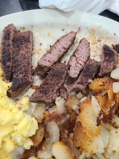 Here's the reason for the low score: I asked for an extra egg ($1.25) in place of the potato ($2.75) that comes with breakfast. I was told I can't do that for a straight-up trade. The prices listed are from the menu and are from the additional sides pricing. Why would you as a business not allow a move that is financially a better option for you and is what the consumer requested as well? The decision that this couldn't be done was decided by the server and was never asked about by any management. The server never introduced herself but had a ghost tattoo on her right upper arm. Refusing to pay an upcharge, I ordered the dish with the American fries without onions, and the fries still had onions. The steak was ordered medium. It came out well, as seen in the picture. The scrambled eggs were bland with no seasoning at all. They tasted like they were boiled in water. In all fairness, the toast was fine. One more thing, the other person I was eating with received their food and was half finished eating before mine came out. They did remove my dish from the bill after only complaining about the onions, I never even mentioned the overcooked steak. I did tell the server that it was silly that I couldn't substitute those items. This was going to be a one star til the order was discounted, which I didn't ask for, I merely asked her how many more onions I would have received if I ordered it...