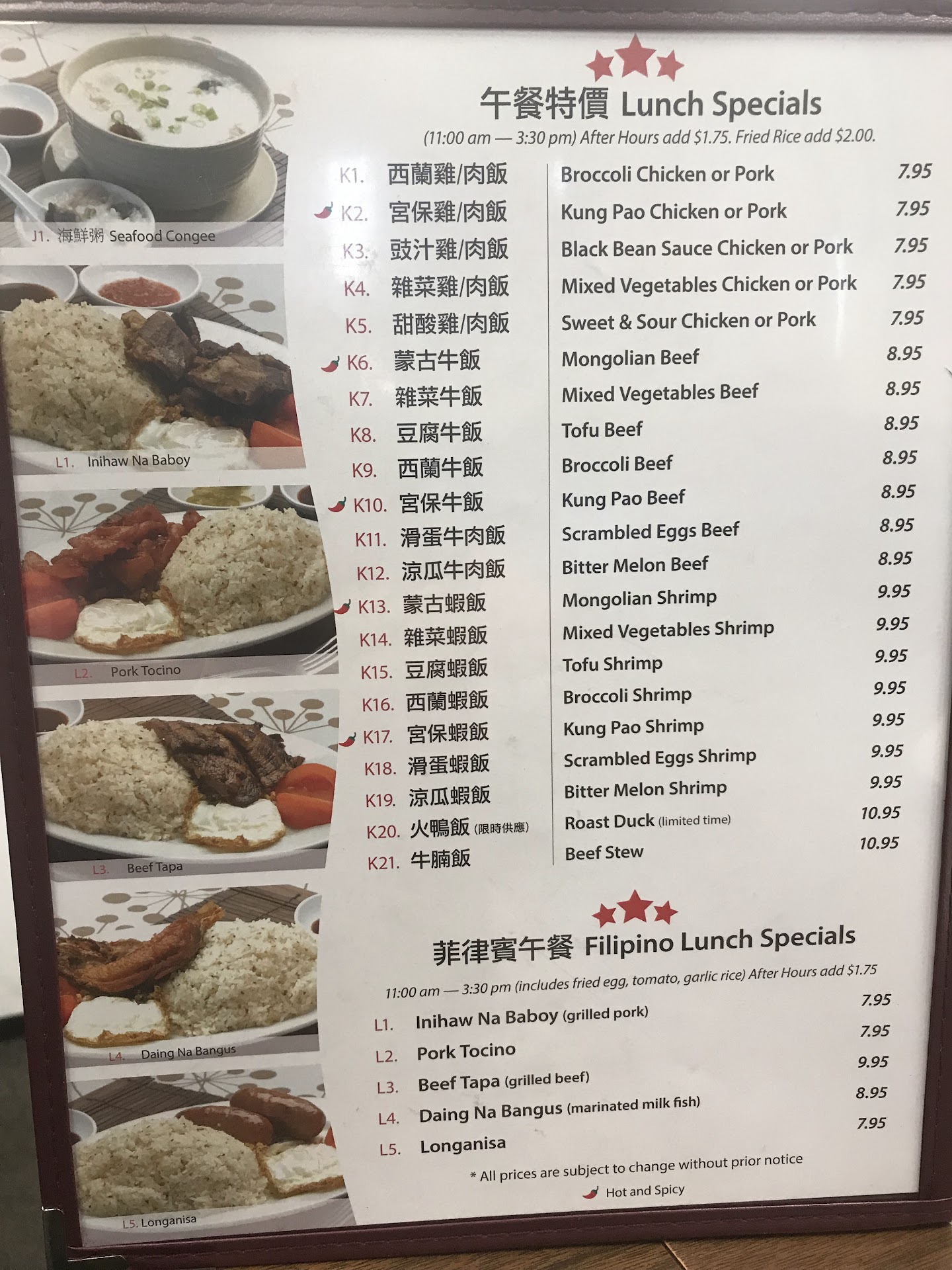 The chicken congee is good and I particularly enjoy it when not feeling well. It's a childhood comfort food for me. Filling, warms you up on a cold day, and just enough flavor. The garlic rice makes a great staple and a nice change from steamed rice. The pork tocino lunch special is decent as well. It comes with a fried egg, garlic rice, and tomato.